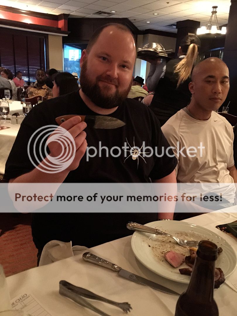 I dont know who ate the most steak, but Phillip took the prize for best steak knife with his special tapered CPM 154 bolstered Electric Orange Palmer. That knife rocks!! Rick is looking at it and wondering what he can offer to trade for it. Me too Rick. I think that we will both be wondering for a very long time.