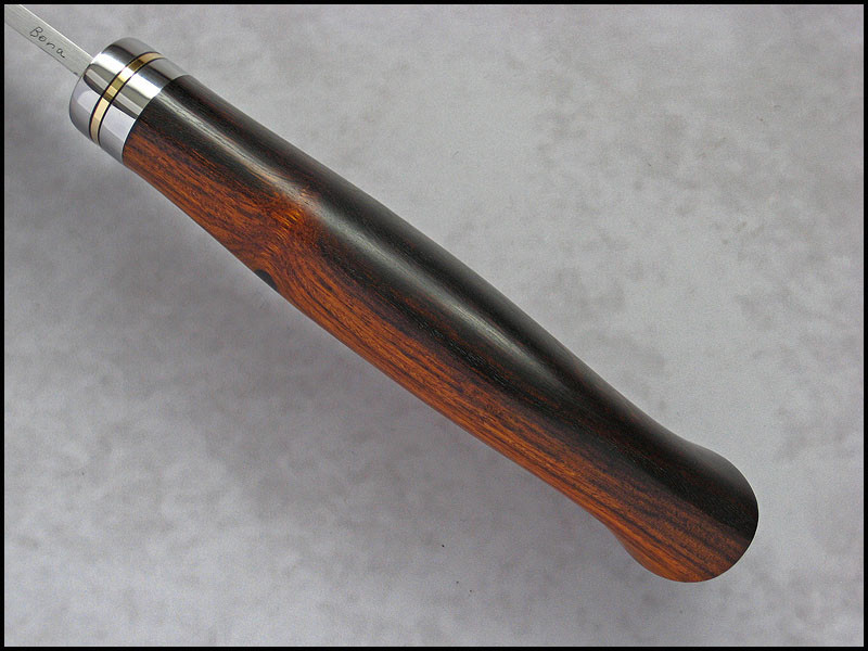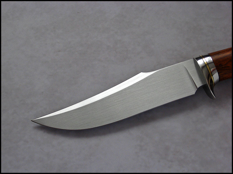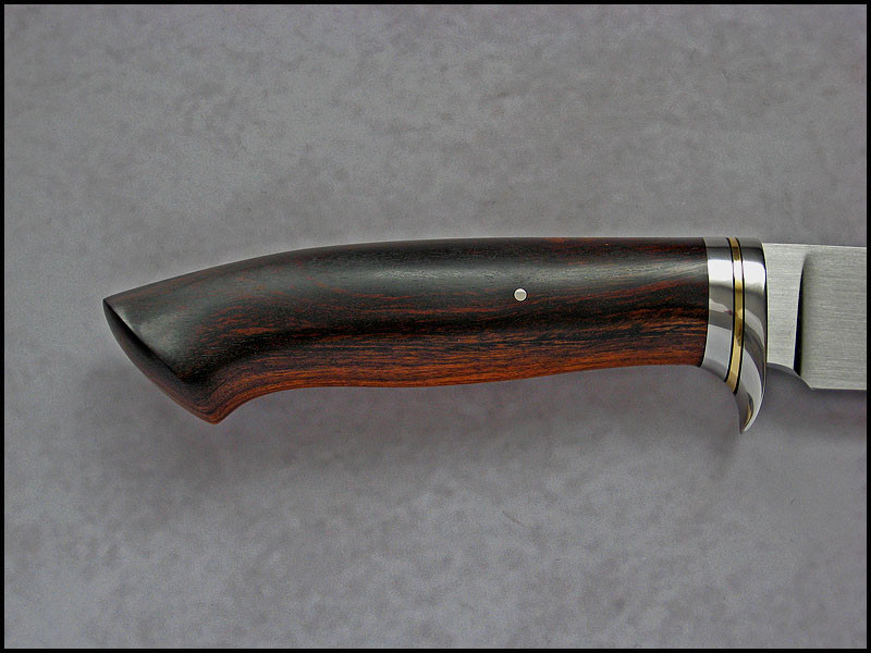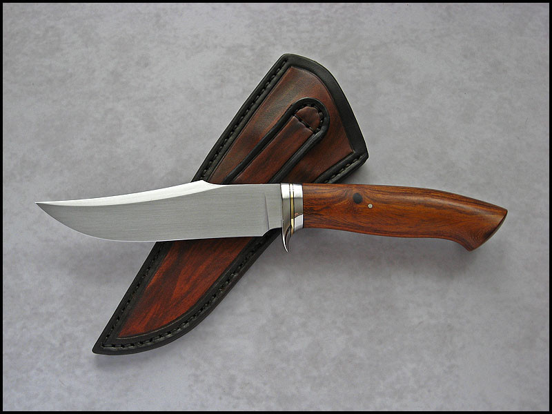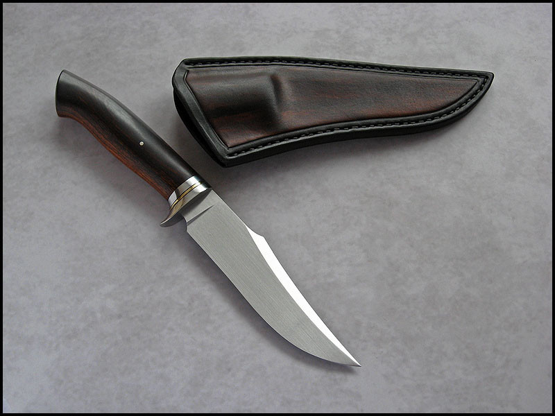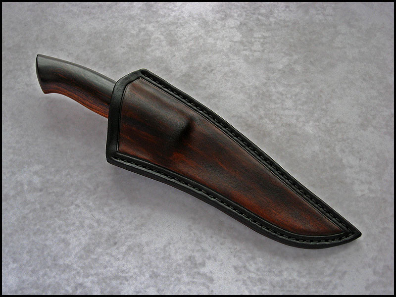 Another Wilk for sale. steel D2 / 3.9 mm [0.153″] length 273 mm [10.748″] blade 141 mm [5.551″] handle stainless steel, brass, black fiber, Ironwood sheath leather Price - $460 SOLD Included International Priority Mail