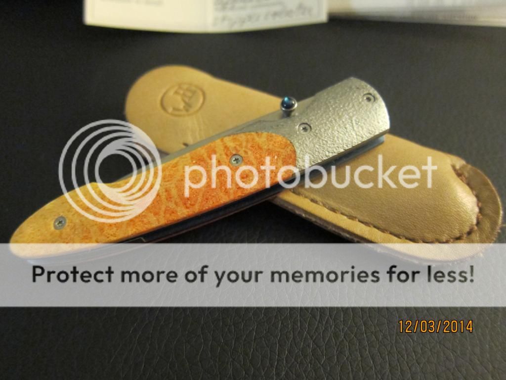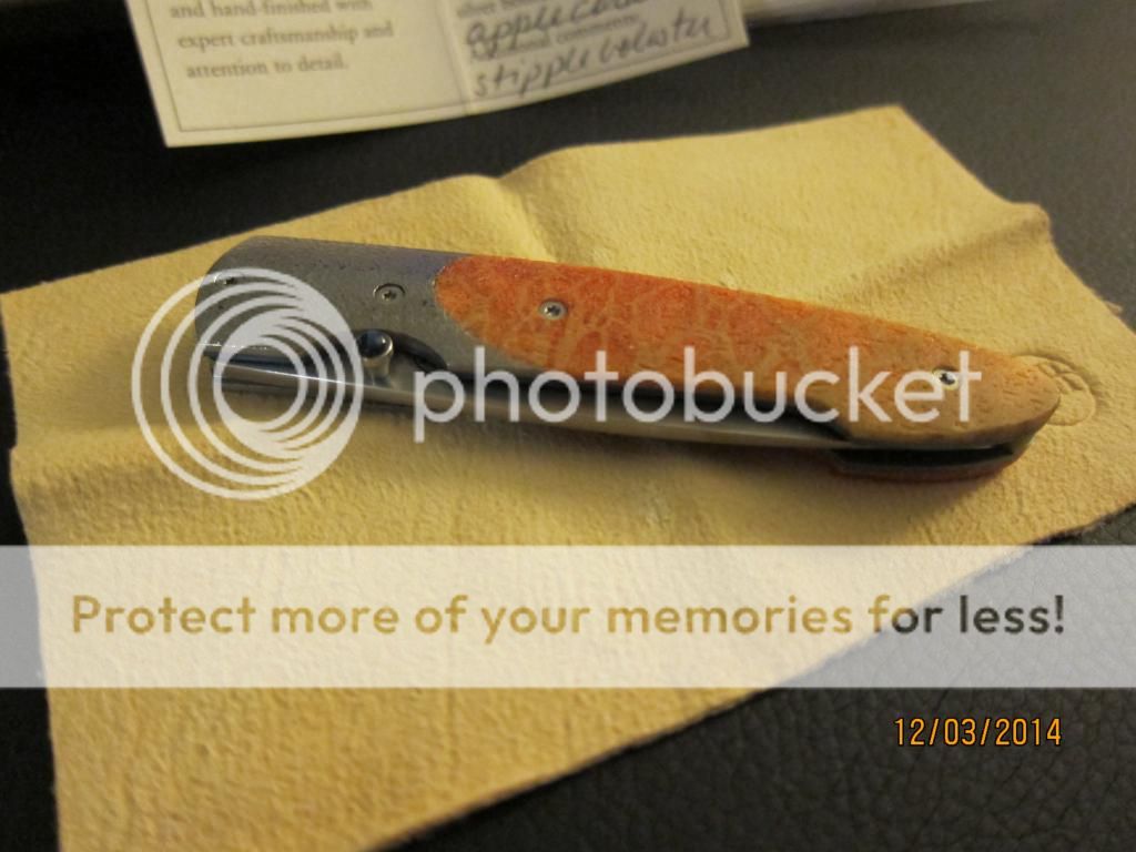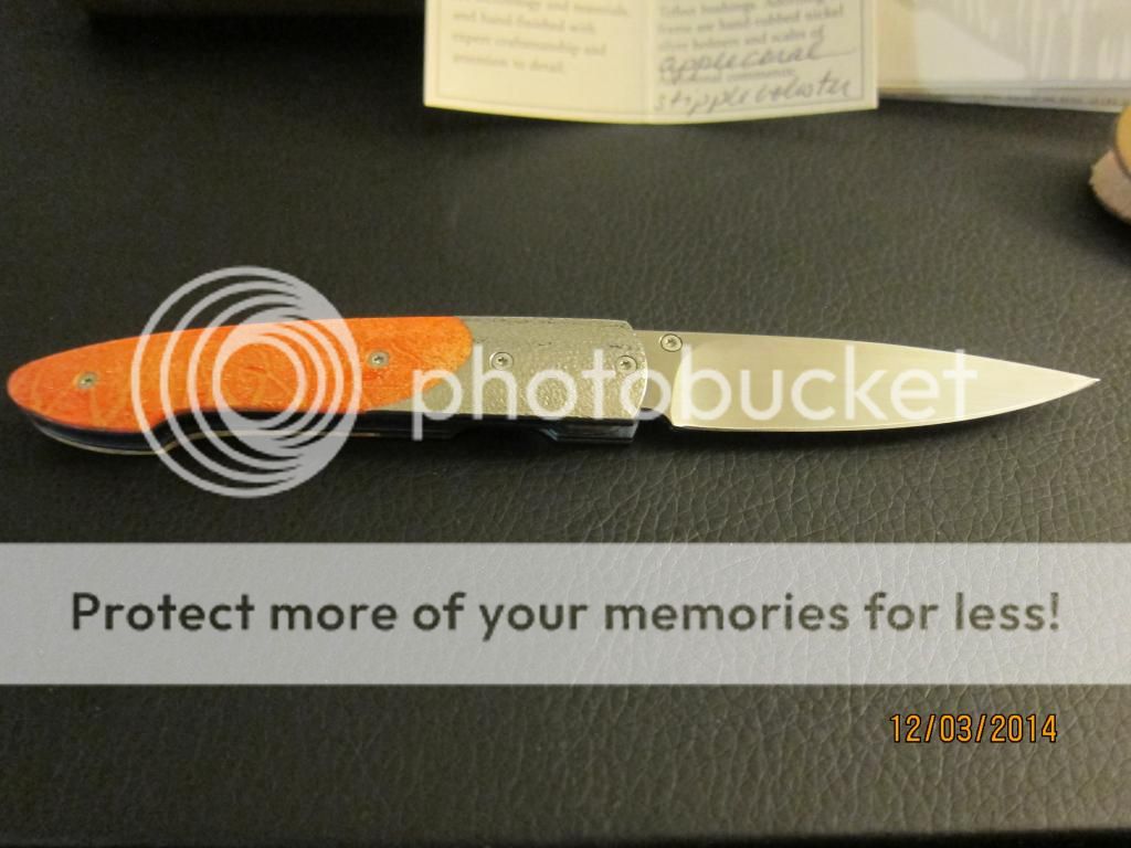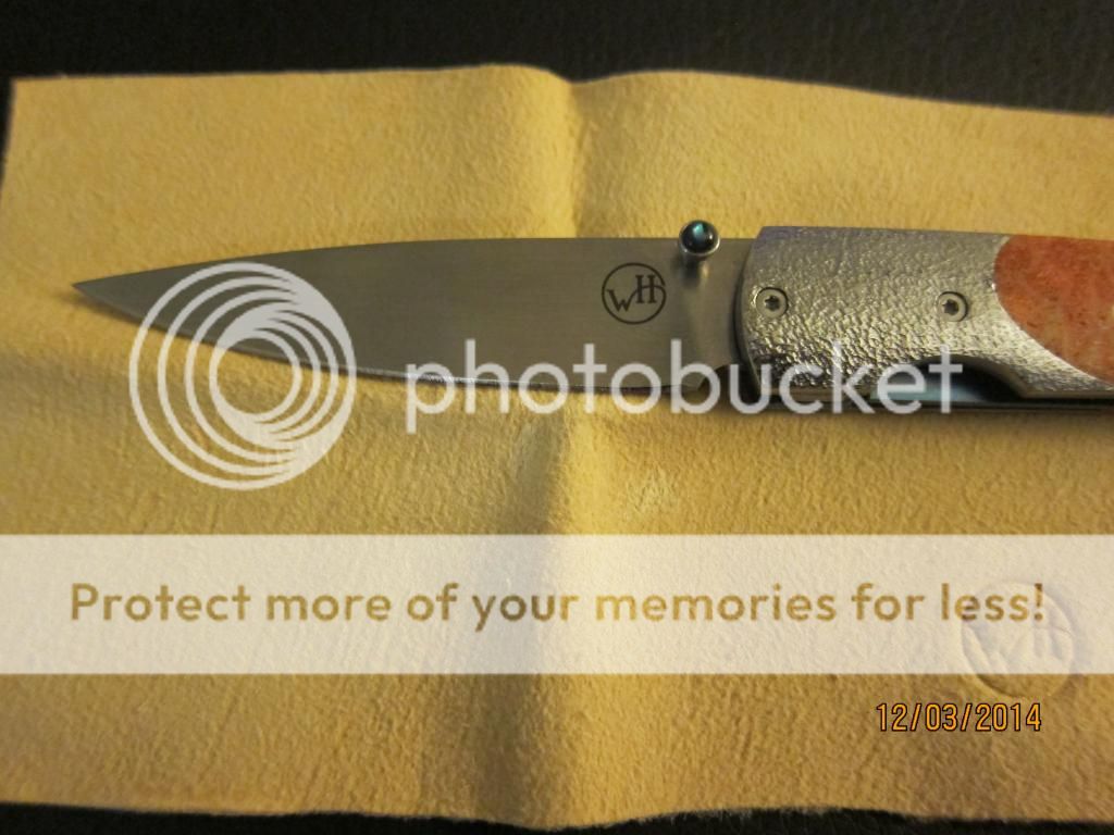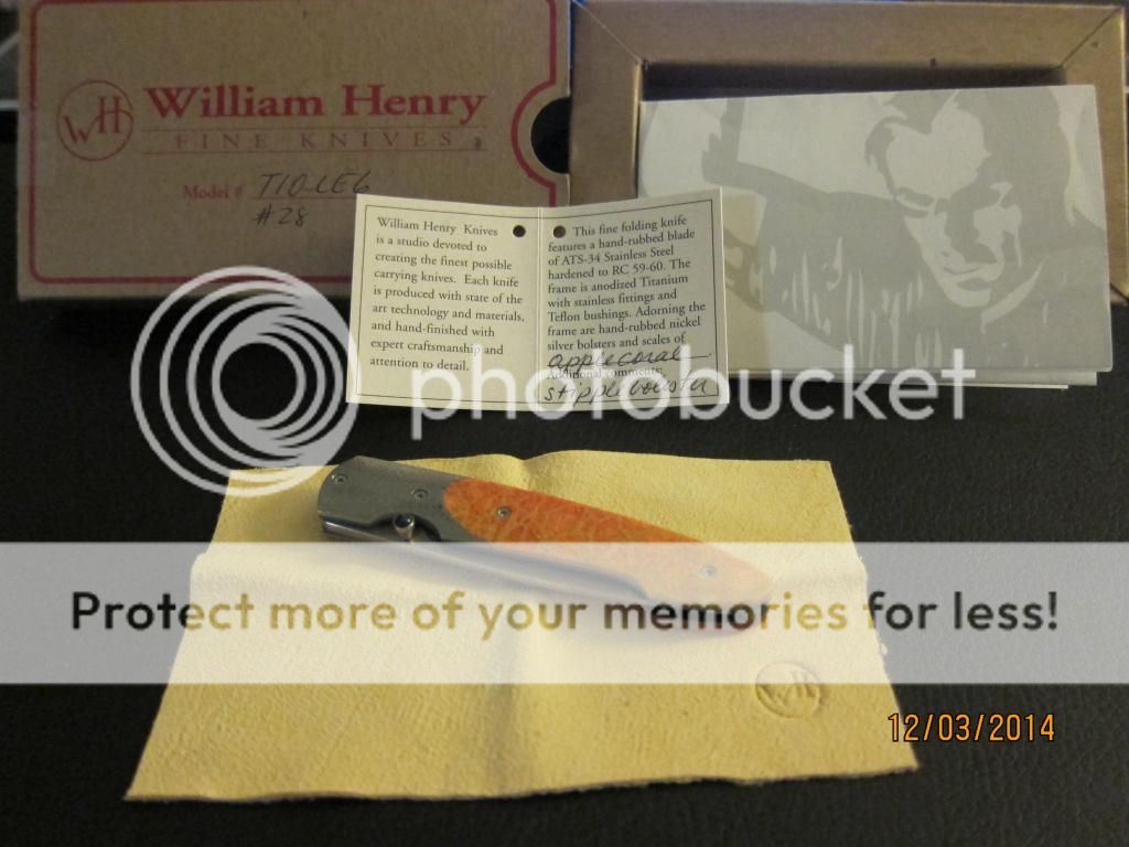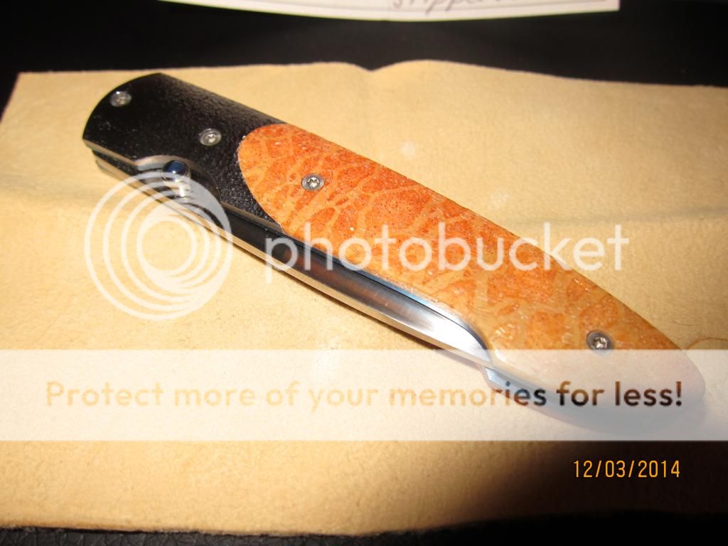 This is a wonderfully beautiful gentlemen's folder by William Henry. The scales are bring orange with hints of yellow and reds while the bolster has the perfect about on stippling to finish the classly look. The anodized good liners and blue backspacer complements the blue gemstone on the thumbstub. Still very sharp with no cosmetic wear on the perfectly hand rubbed blade finish. Limited number, #28.. Still just as stunning as the day it left the factory.
