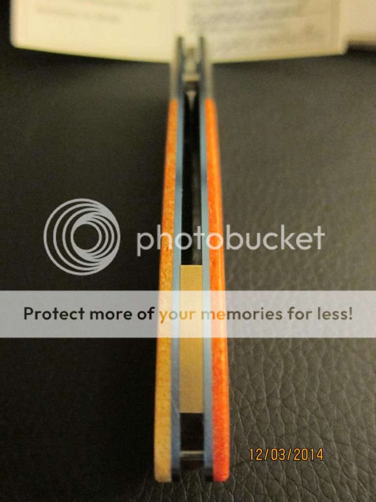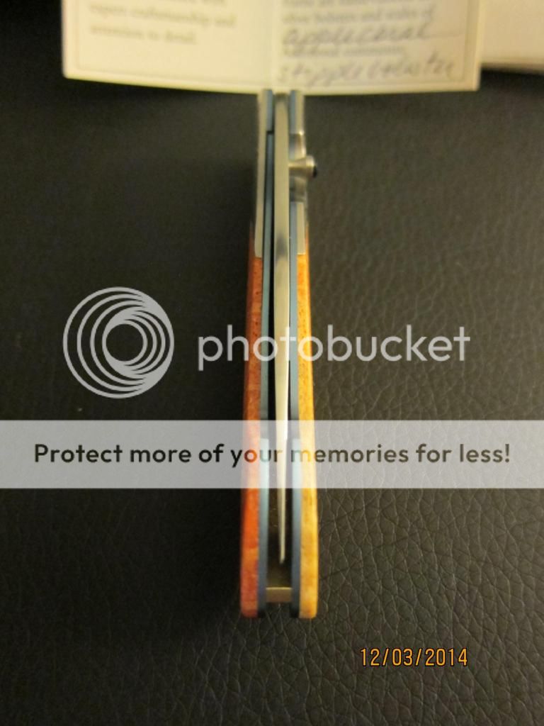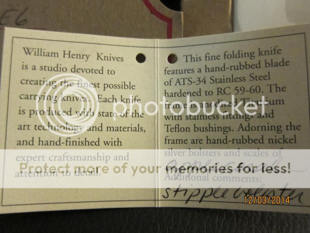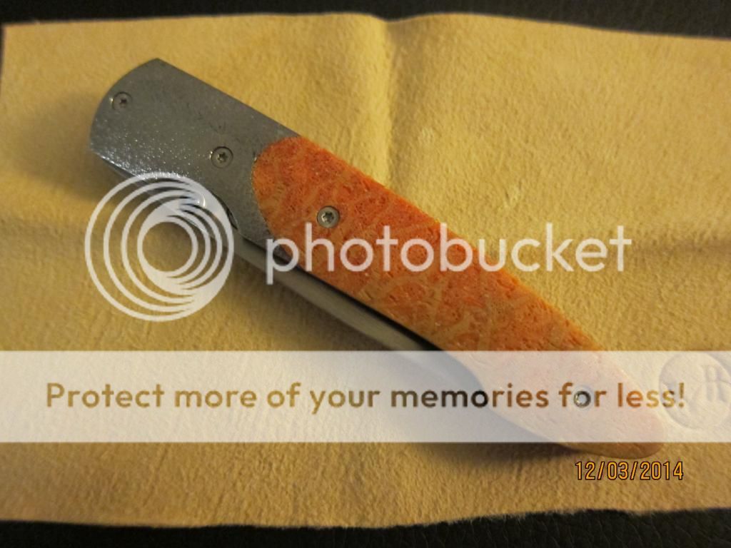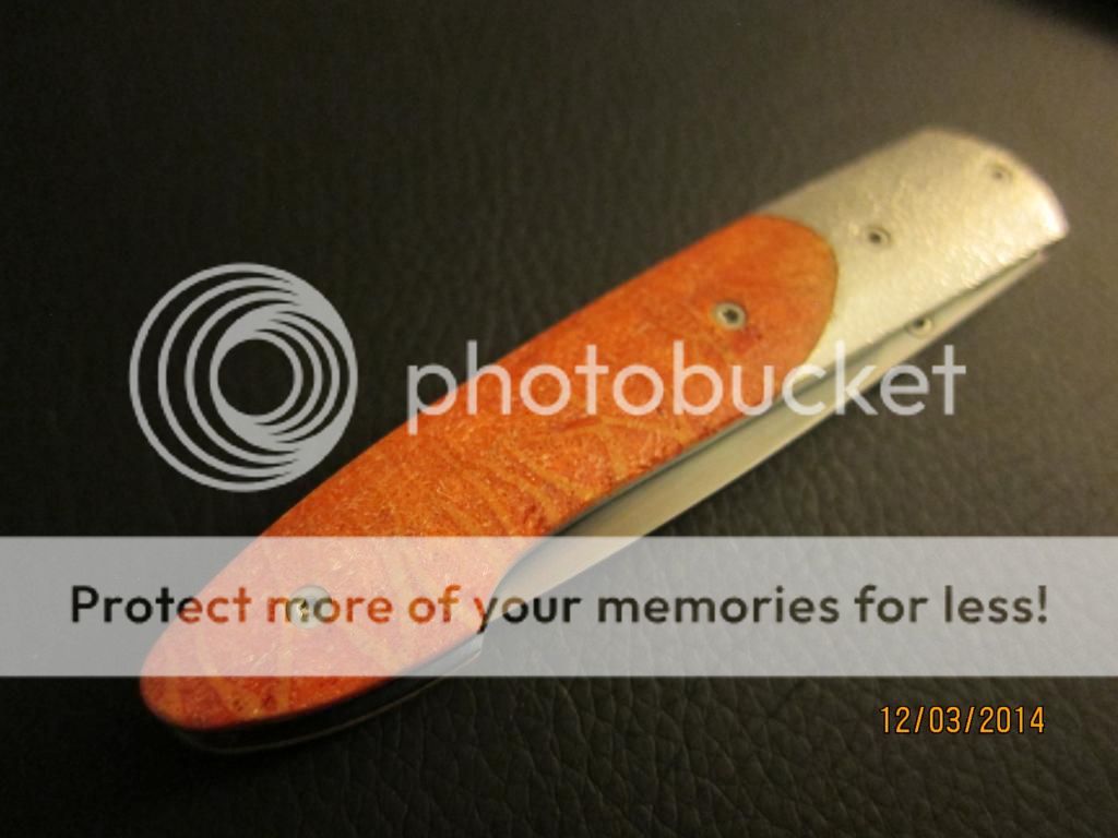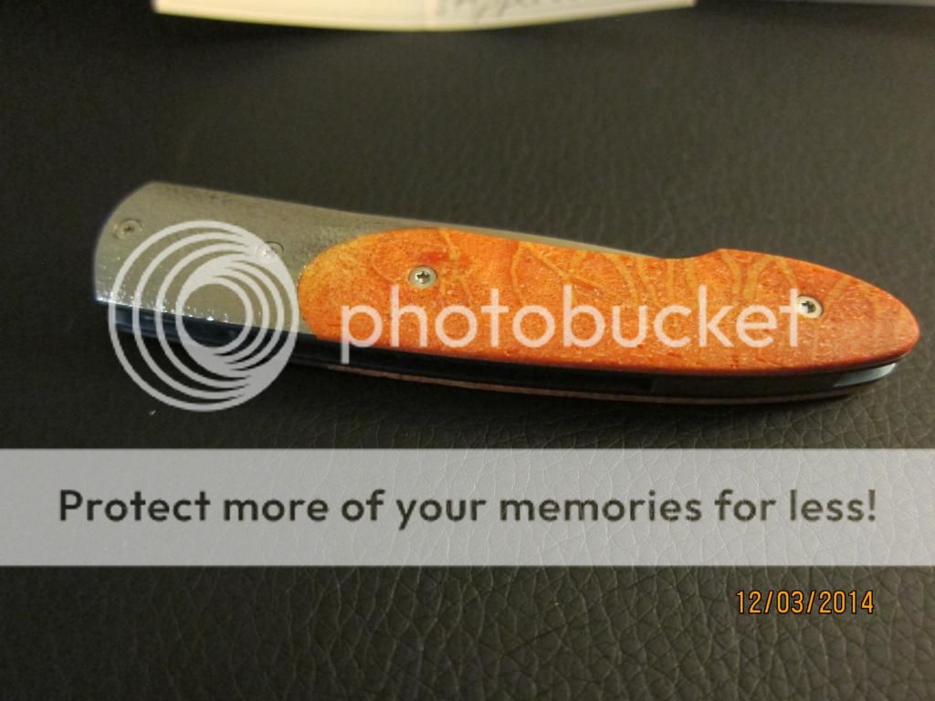 This is a wonderfully beautiful gentlemen's folder by William Henry. The scales are bring orange with hints of yellow and reds while the bolster has the perfect about on stippling to finish the classly look. The anodized good liners and blue backspacer complements the blue gemstone on the thumbstub. Still very sharp with no cosmetic wear on the perfectly hand rubbed blade finish. Limited number, #28.. Still just as stunning as the day it left the factory.