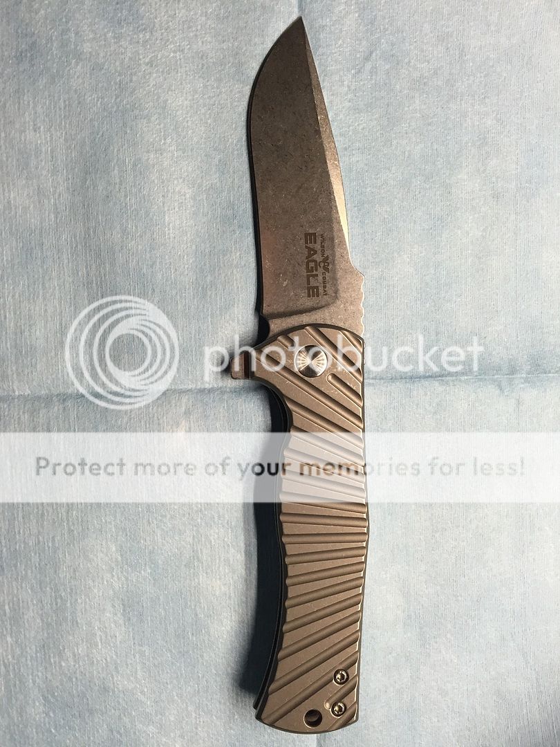 Only from Wilson Combat in collaboration with acclaimed Custom Knifemaker Les George. A Wilson Combat exclusive, the EAGLE is a rugged, framelock flipper design with the Wilson Combat signature Starburst Titanium handle pattern and Carpenter XHP Super Steel stainless tool steel recurve blade for the ultimate in edge holding and corrosion resistance. The EAGLE is one of the fastest opening manual tactical folders on the market. The trigger finger flipper is lightning fast into action and easy to operate with or without gloves. The light weight and slim profile will ensure the EAGLE will spend a lot of time riding shotgun in your pocket every day. The handle of the EAGLE is precision machined and smooth tumble blasted lightweight Titanium with a robust integral framelock, chamfered lanyard hole and Titanium deep-pocket clip that can be positioned for blade tip up or down opening. The rugged open-frame construction makes it easy to clean trapped dirt and lint. Unlike many other tactical folders that are blocky and overweight, the EAGLE has been designed to be slim and easy to carry without sacrificing any strength or performance. The precision ground and finished 3.6" blade of the EAGLE is a high performance tactical clip point profile with a slight recurve for impressive cutting power. The Carpenter CTS XHP powdered alloy steel has all the strength and edge retention of the best tool steels with superior corrosion resistance. The hand sharpened blade is polished to a smooth, non-reflective high luster for easy maintenance and rides on pure Teflon bearings for a lifetime of glassy smooth operation.