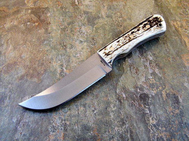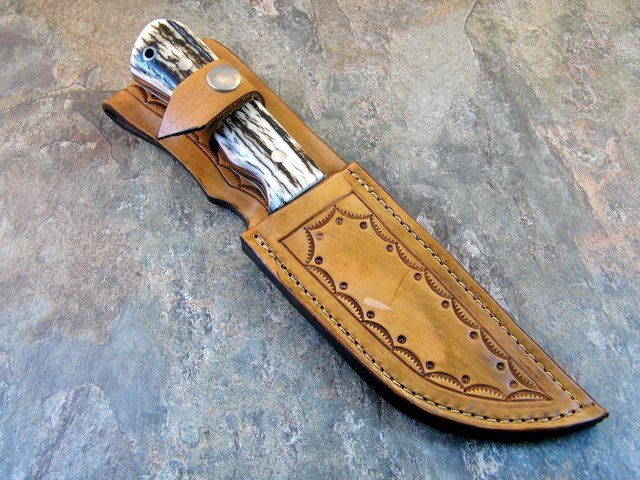 5 3/16". Hair popping sharp! Scales are elk antler that has been stabalized . Has red liners. I have used a lot of elk and it don't get no better than this. 3 stainless steel handle bolts. Stainless steel thong bushing 1/4" for lanyard. Sheath 7-8 oz tooled cow hide. Price $225 shipped in USA. I accept money order, check or paypal [wilsonknives18@yahoo.com] Unknown spot on sheath!! Probably scratched before dying.