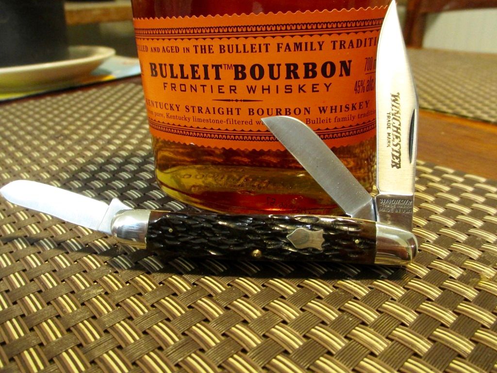 One other downside was the discovery (using a loupe) of a minor crack at the bolster pin, first thought it was jigging but unfortunately not. It may have been there from the start but the less than diligent seller put the Stockman in its Winchester Black Box inside a larger mailing box with no extra padding..Result, it was rattling when I picked it up, such idiocy! :grumpy: So, that might've generated the crack as the knife was out of its presentation box banging about free in the delivery box aaaaarrghhh Complained about this but I suppose they'll just shrug their shoulders Just incompetent and an invite to thieves. Here's a picture that kind of shows this nice bone off, needed a drink after that long icy and stormy drive