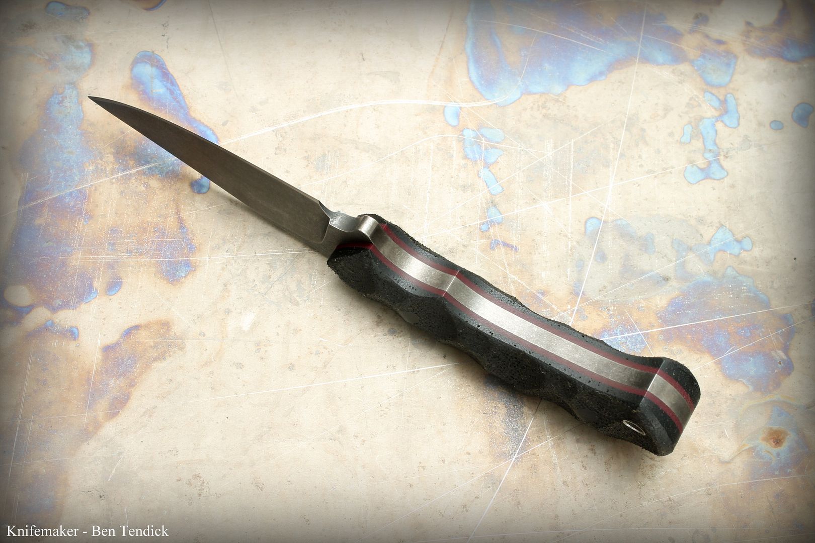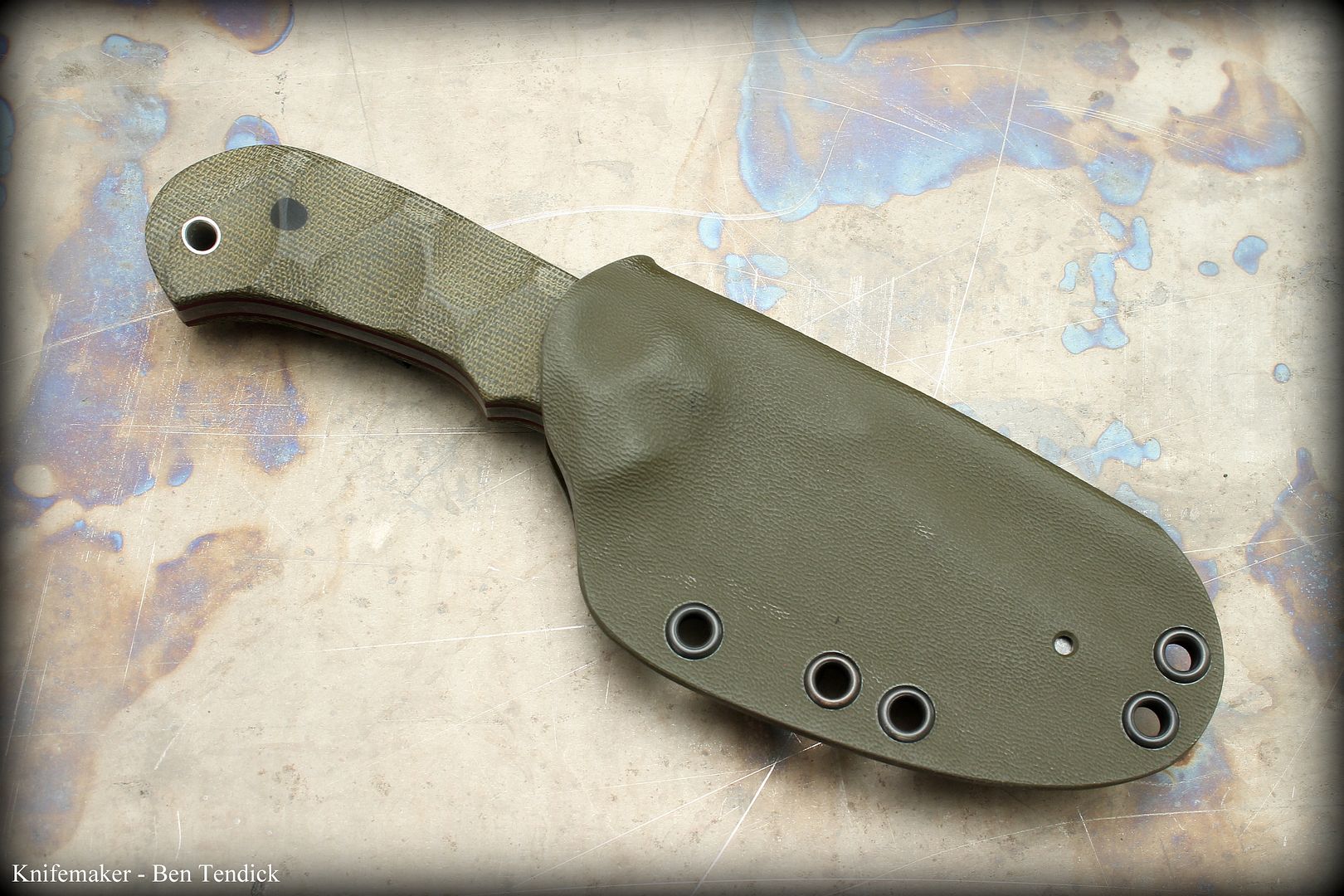 I just finished up a couple more of these Wingman models and they are now up for grabs. These are all 3/16" CPM 3v. This time around I did scalloped scales instead of smooth. I really like how these just melt in your hand, super secure in a number of grips. Your thumb rides right up behind the harpoon tip, which acts like a nice little thumb ramp. They have a nice acid wash finish all the way around. I left these with a full thickness tang that is skeletonized. These snap securly into to their kydex sheaths and can be carried in any position including inverted. These have full height semi convex grind.