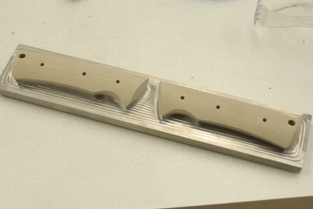 I've been pretty sick for the last 4 days, but in between sleeping and feeling like death I've been working on the toolpaths for the handle scales. Took quite a while as they're fairly complicated.