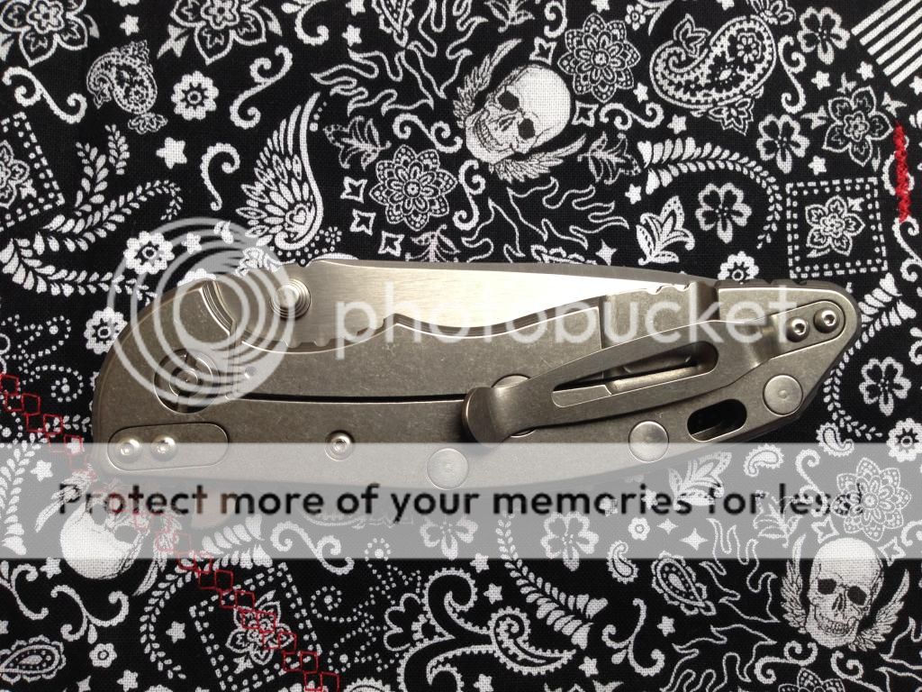 Gen 2 Custom Spanto with stonewashed Textured Ti scale, this comes with brass standoffs and original standoffs and white box and tactical peanuts.. This knife has been a user and shows it. I have sharpened it to 22 degrees per side and is sharp. There is some light scratched on the polished flats and satin finish that can be seen in the pics... I have priced accordingly.. The lockup is solid and is very smooth! Flips great!!