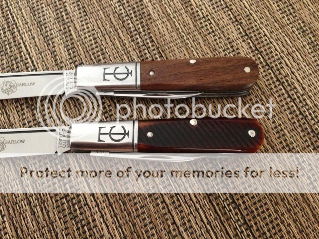 I've got two brand new Great Eastern Sheepsfoot TC Barlows that I just received from Charlie, one in Walnut, the other in Antique Yellow Saw Cut Bone. I didn't listen to my gut on this purchase and I bought these even though I wasn't thorougly convinced about the Sheepsfoot blade. I'd like to trade these for 2-blade GEC Spearpoint Barlows.