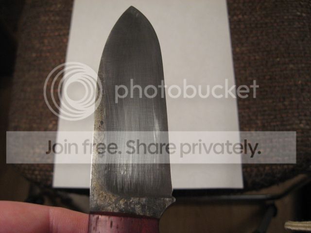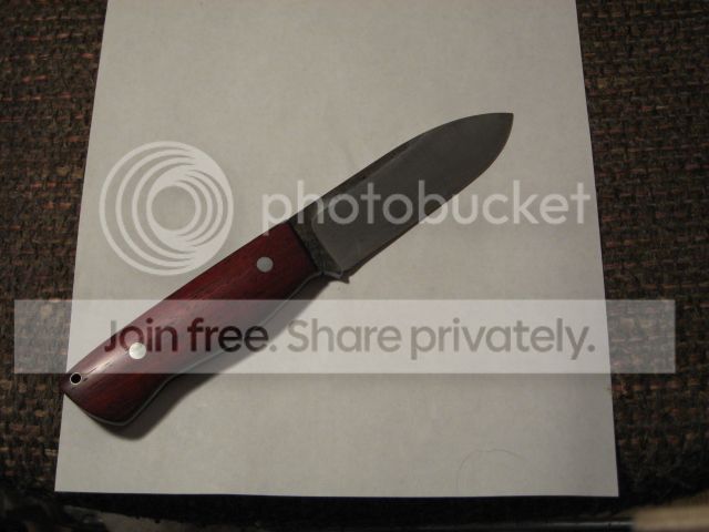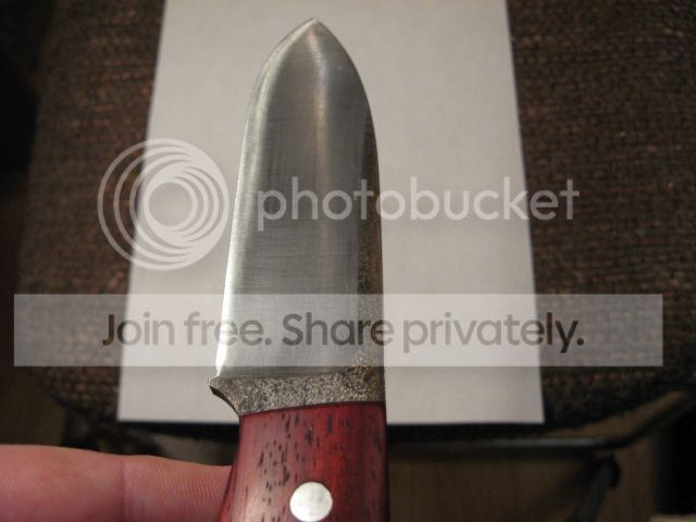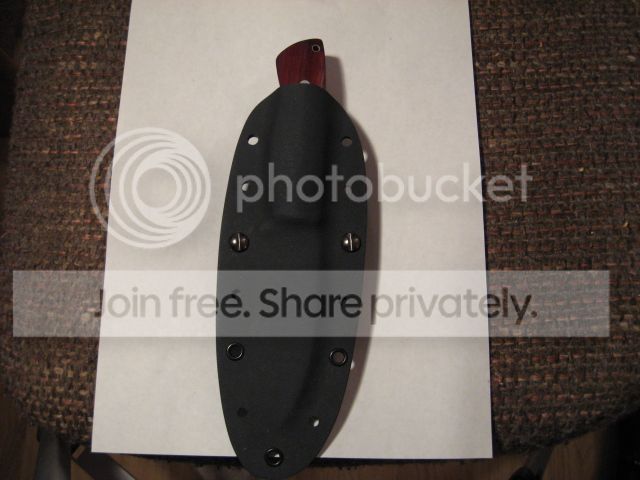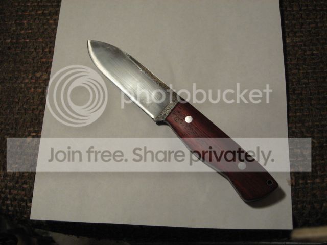 "3/16th" steel (1095 - I think). Bloodwood handles. This knife has seen some use. There are scuff marks on the blade (from the Kydex sheath). I do not know if the scuff marks will buff out - I haven't tried to remove them. This knife handles really well; it has a bit of heft to it, but the balance is spot on."