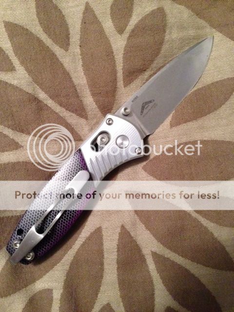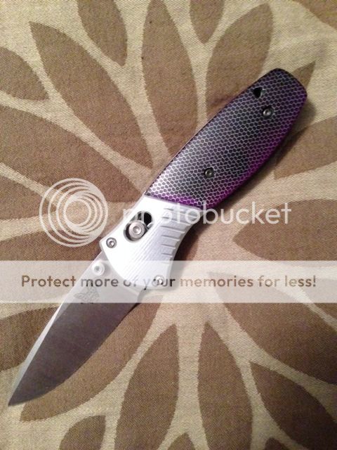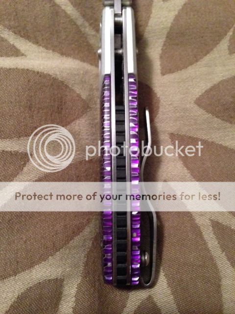 First, I have a LNIB Benchmade Mini Barrage in M390. I made some custom purple C-Tek scales for this knife and I made a custom low-ride Ti clip for it. If you know about C-Tek you will know it is usually only used on very expensive customs. This is due to the premium price for the materials. I put it in my pocket three times and have cut a piece of paper to test the edge. The assist is very fast. I removed the safety because it was pointless and ugly.