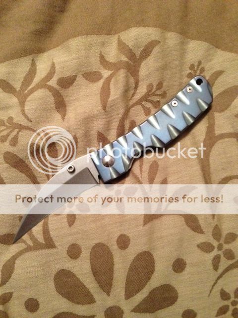 Second, I have a LNIB Discontinued Kershaw 1420 Ti. I never thought I'd sell this one. I sculpted and stonewashed the Titanium scales. I also stonewashed the blade and the low ride clip. Then I sculpted the aluminum back spacer. There is a small mark on the right scale. The anodization helps to conceal it. Maprik on this forum did the two-tone blue anodizing. I have not carried the knife since it was anodized. This knife is one of the smoothest opening knives I have. It is a rare bird will plenty of custom work on it. I'm only asking $175 + $5 shipping. Paypal gift preferred but not necessary.