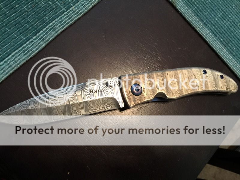 Jeff Hall folder Made in 1999 when he was first starting out, my dad commissioned this piece. Blade and handle are Damasteel, with the handle having been etched to a very light gold/yellow color. Hardware is anodized blue. Knife has been in a safe all these years, never used or carried. Blade is about 3 1/2", false edge not sharp. Priced to sell at $SOLD shipped in the US