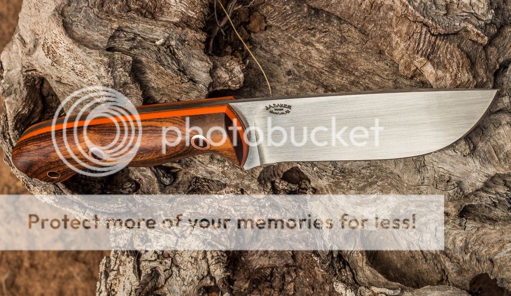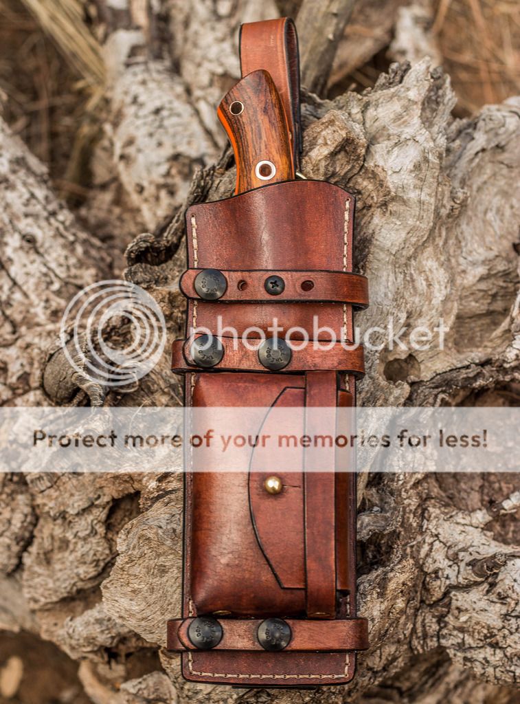 I have this Woods knife combo up for sale today. This one has an AEB-L blade with a hand rubbed, satin finish. The handle has cocobolo scales with thick orange G10, brown Micarta spacers and copper tube pins.The handle is full size and thick. The Scout sheath has hand stitching and the pocket fits a full size "Altoid" type mint tin. It is completely modular and has Pull The Dot snaps. Comes with a removable dropper loop and straps.