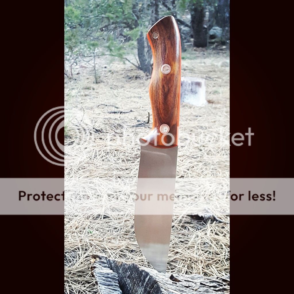 I have this Woods knife combo up for sale today. This one has an AEB-L blade with a hand rubbed, satin finish. The handle has cocobolo scales with thick orange G10, brown Micarta spacers and copper tube pins.The handle is full size and thick. The Scout sheath has hand stitching and the pocket fits a full size "Altoid" type mint tin. It is completely modular and has Pull The Dot snaps. Comes with a removable dropper loop and straps.