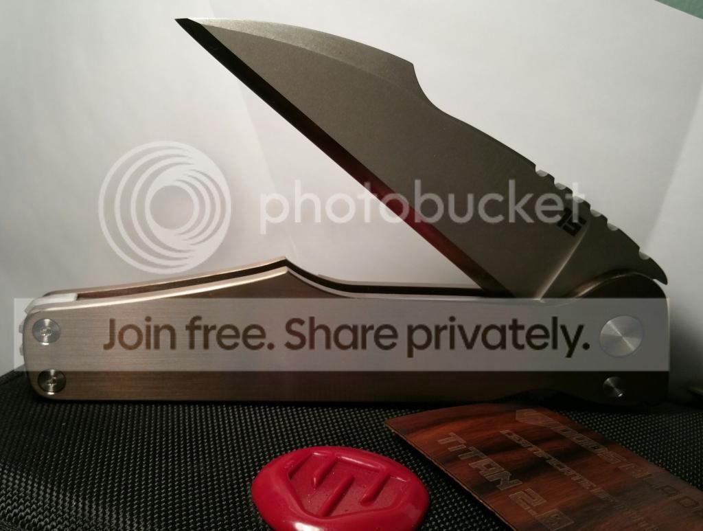 William Woods Titan 2. Just recieved and hate to let this one go. But bills come first... Flips like a rocket! Considering its size it opens incredibly smooth! Beautiful Bronze Ano that Will has perfected. Only 20 produced. It is razor sharp. A true art on such a thick overbuilt knife. Will ship Priority Mail Insured. SPF! !!!
