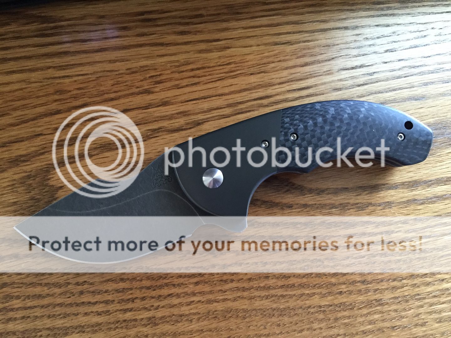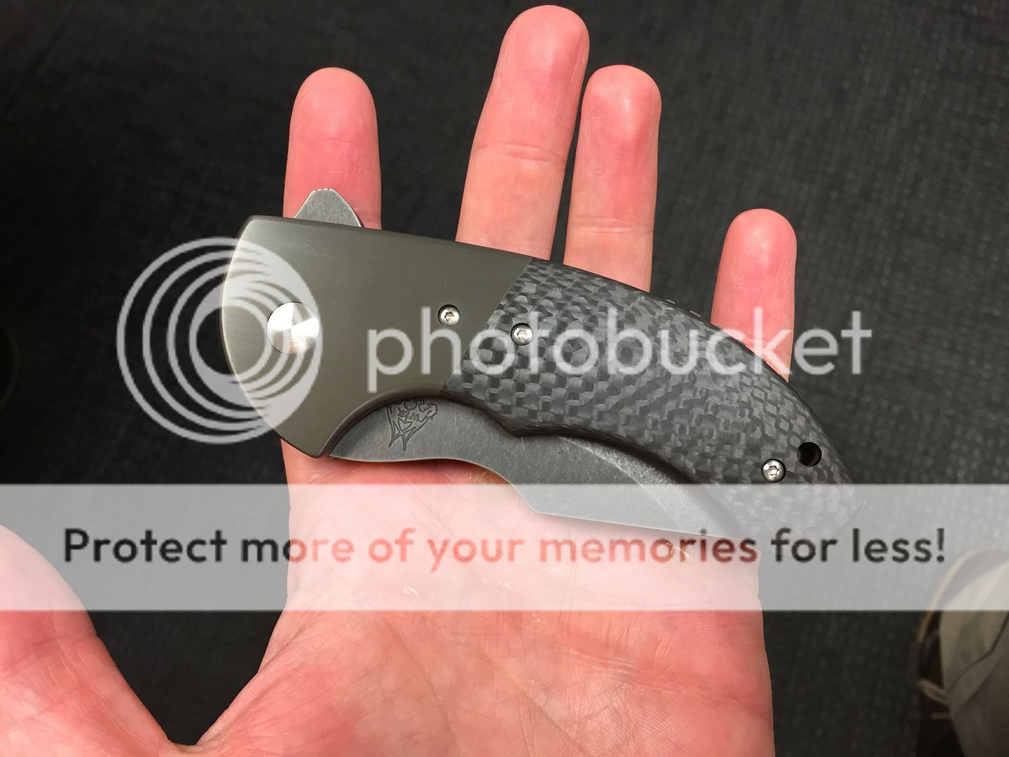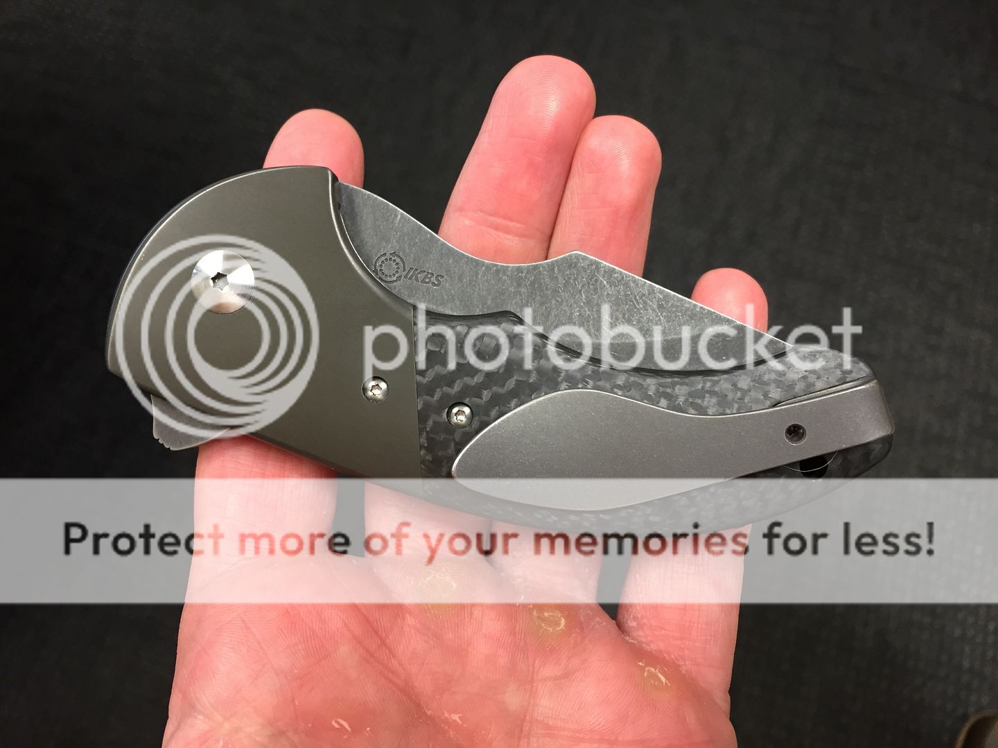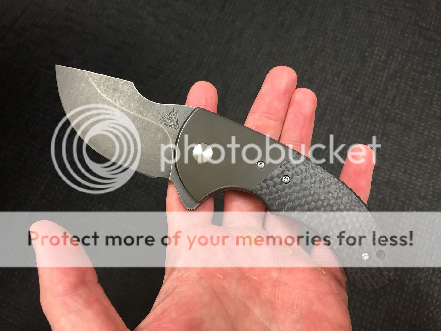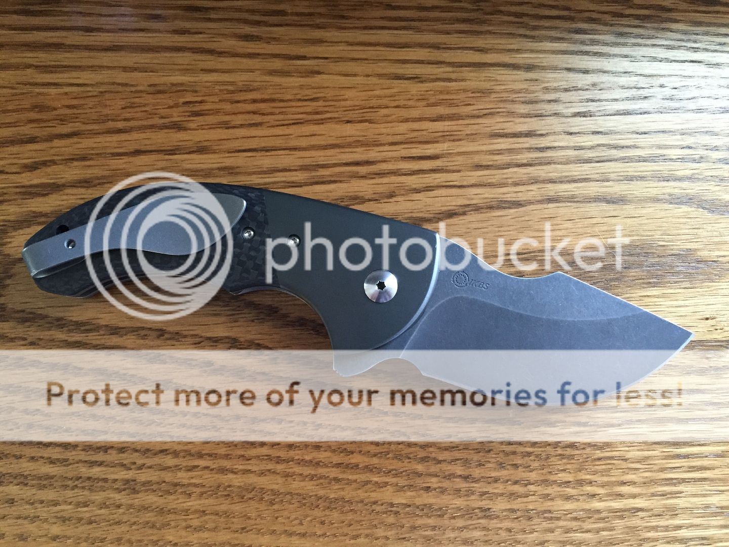 WR Bladeworks mini SKF flipper with zirc bolsters and carbon fiber scales. The blade is centered and fires open like a rocket thanks to the IKBS. The only flaw is cosmetic and is on the clip side bolster. It is a very light scratch that can easily be taken care of by Walter. I tried to get a good photo of it.
