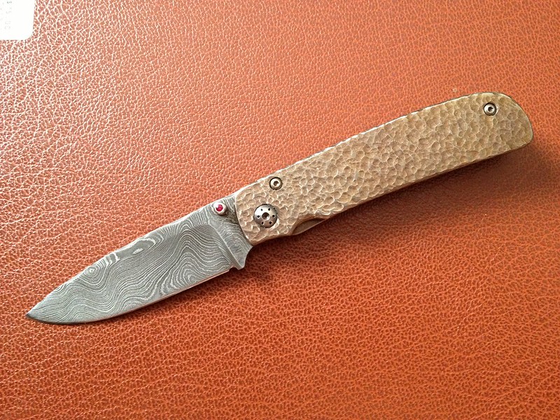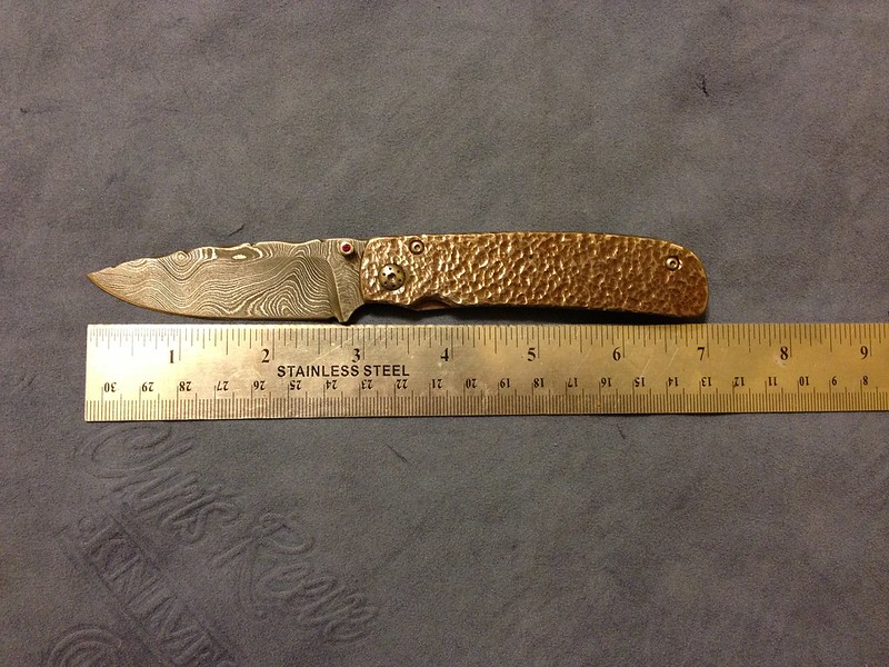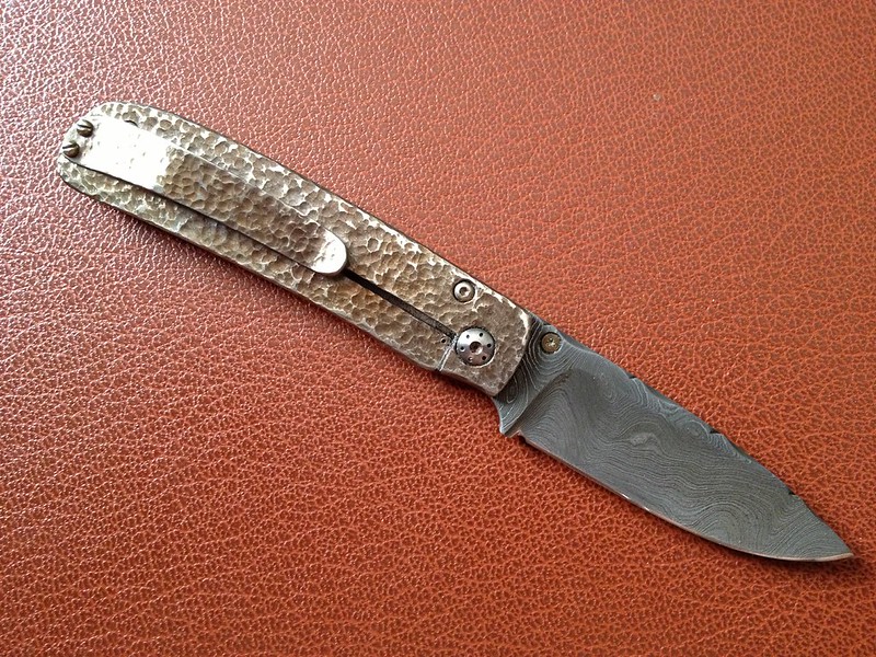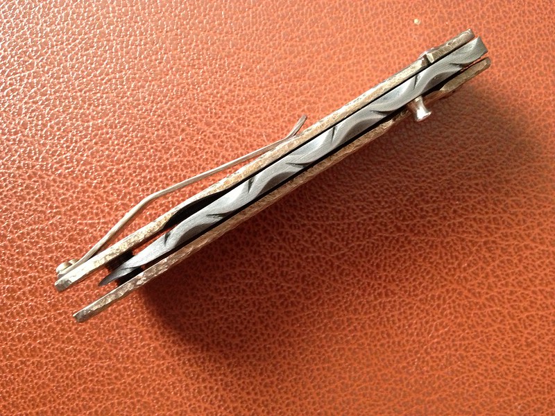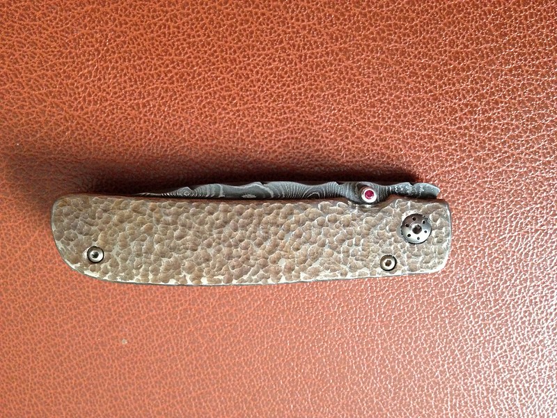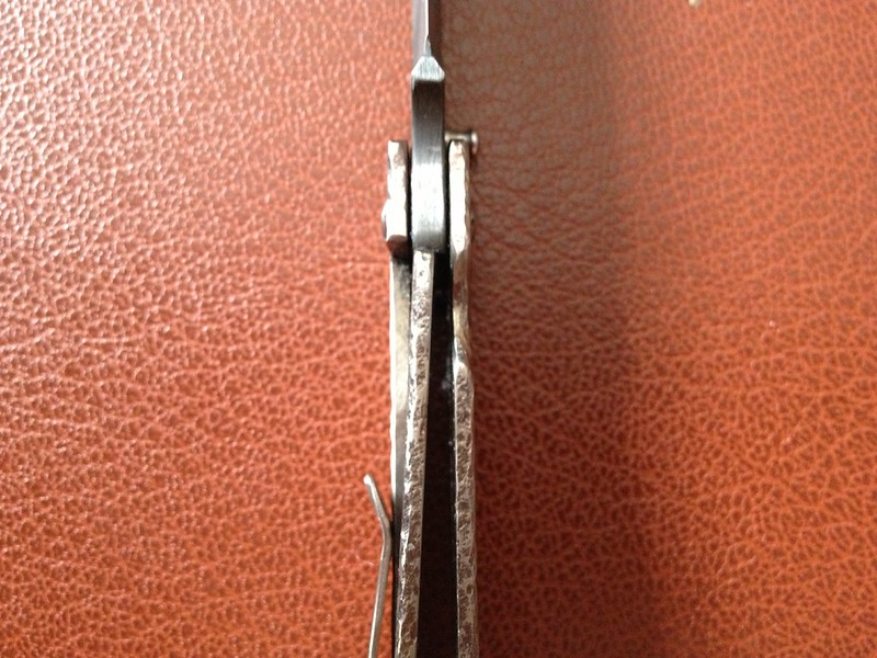 Up for sale is this Alan Davis that I got in a trade. It's a catch and release from a trade. I love the blade and the file work done to the spine, but I could just not warm up to the handle. It has only been carried a handful of times and cut only a scrap of paper. Lock up is like a bank vault and it flicks like a rocket. The blade appears to be a hair off center to the non-locking side. I could be wrong and it's dead center, but I would rather disclose this possibility. The lock up is about 50-60%.