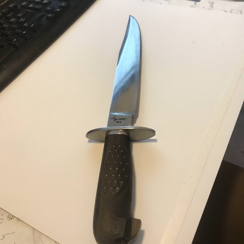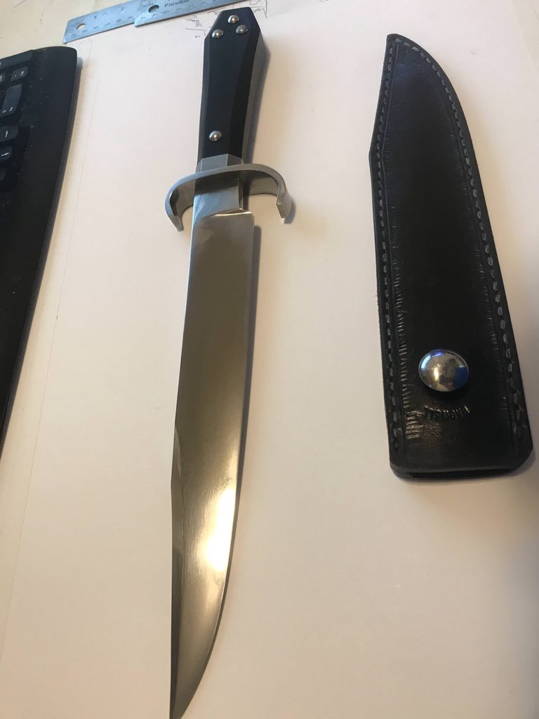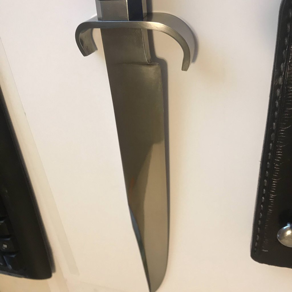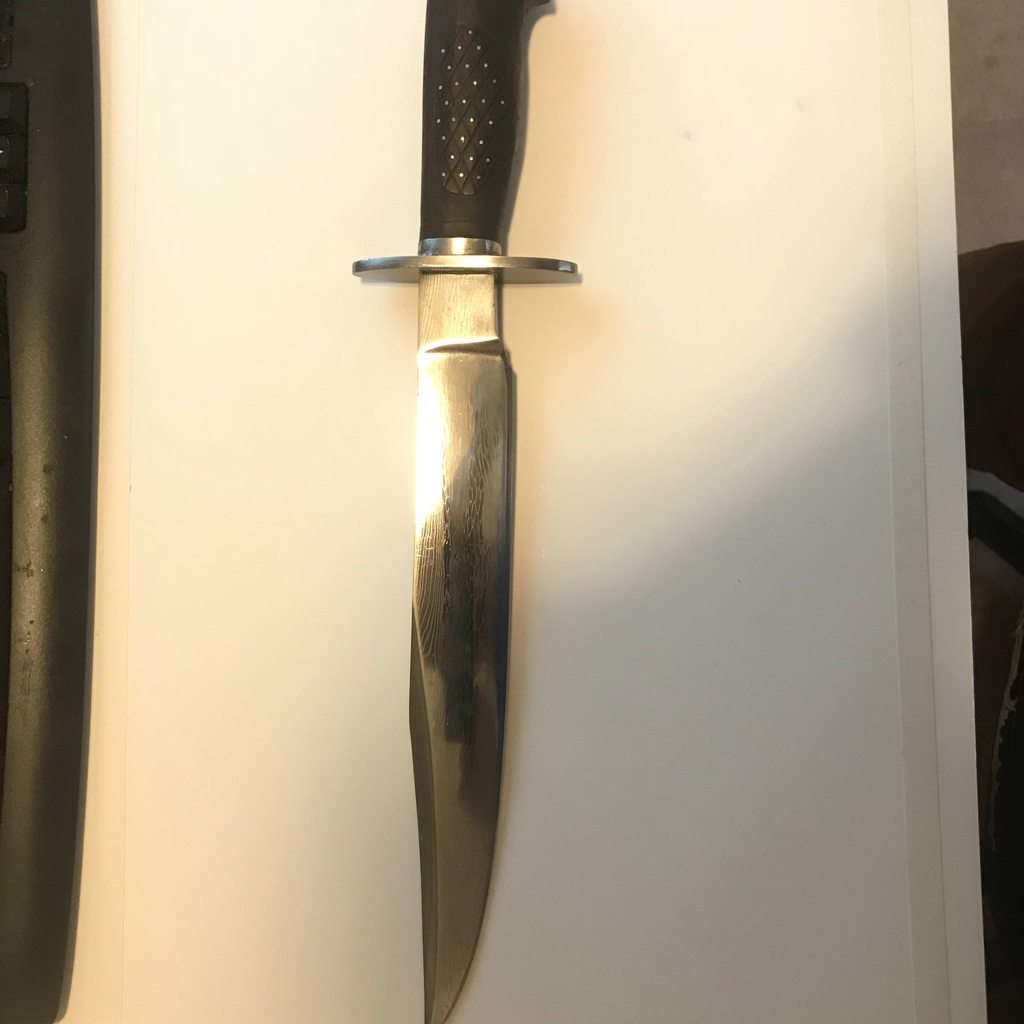 Next up is Bagwell Damascus survival knife with bird head grip. Sorry lost the sheath. The blade is extremely beefy. The thickest part of the spin is over 0.423 inch. To put that in perspective, the carbon helles belle is 0.285 inch.