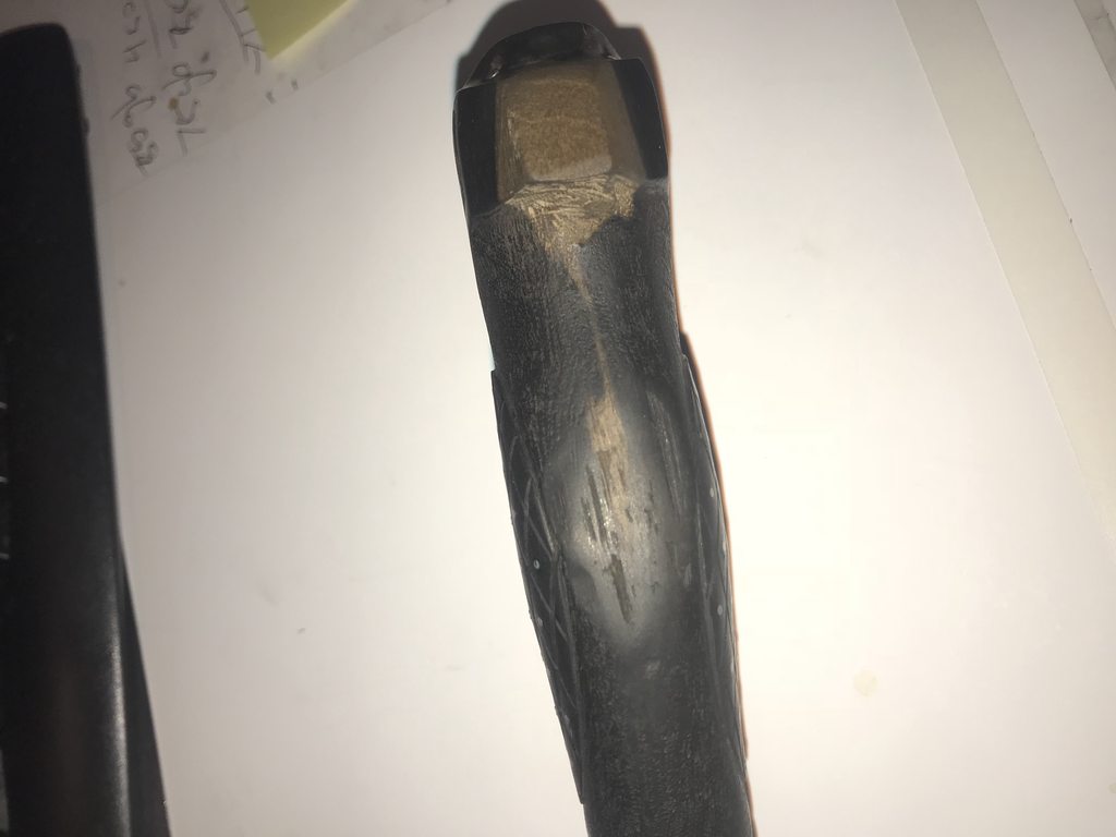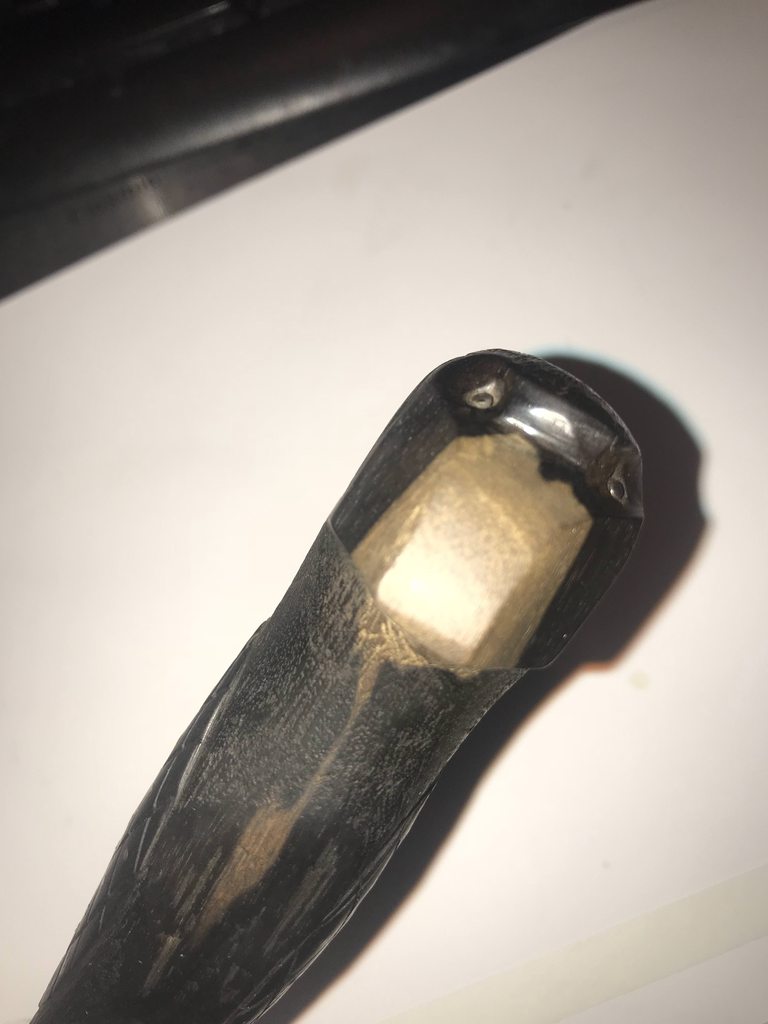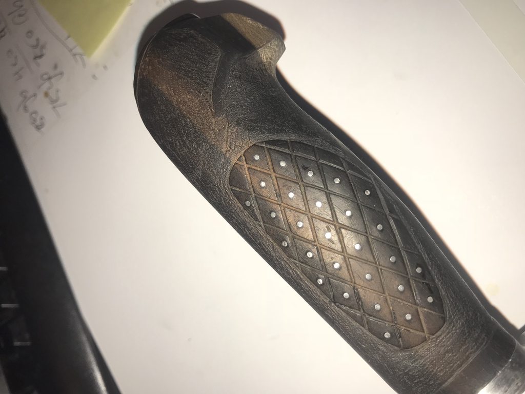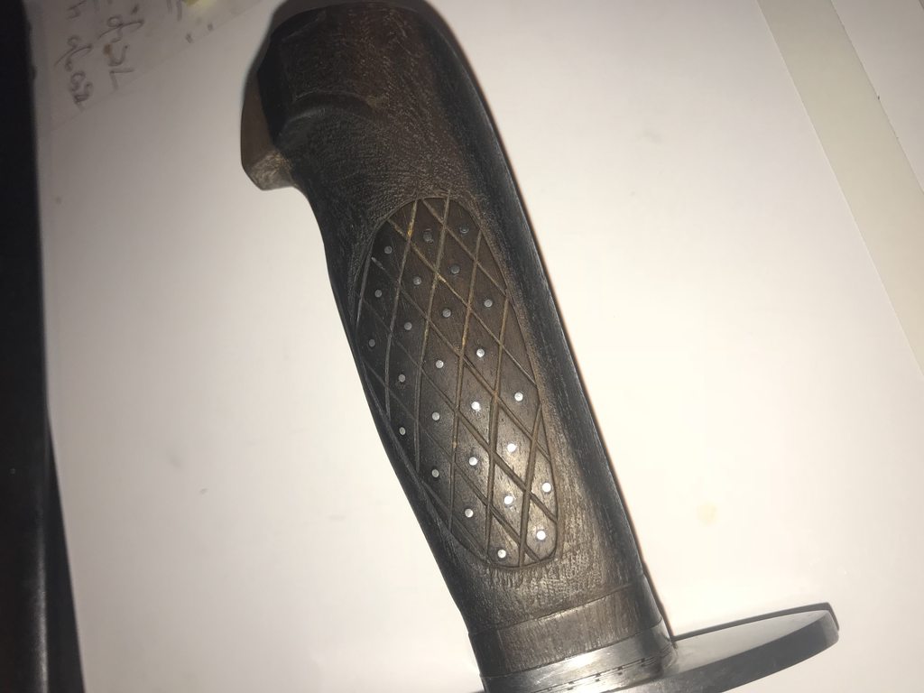 Next up is Bagwell Damascus survival knife with bird head grip. Sorry lost the sheath. The blade is extremely beefy. The thickest part of the spin is over 0.423 inch. To put that in perspective, the carbon helles belle is 0.285 inch.