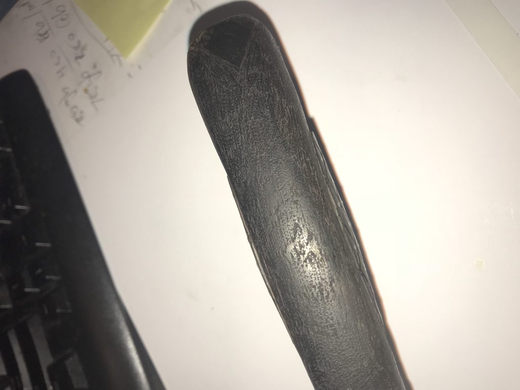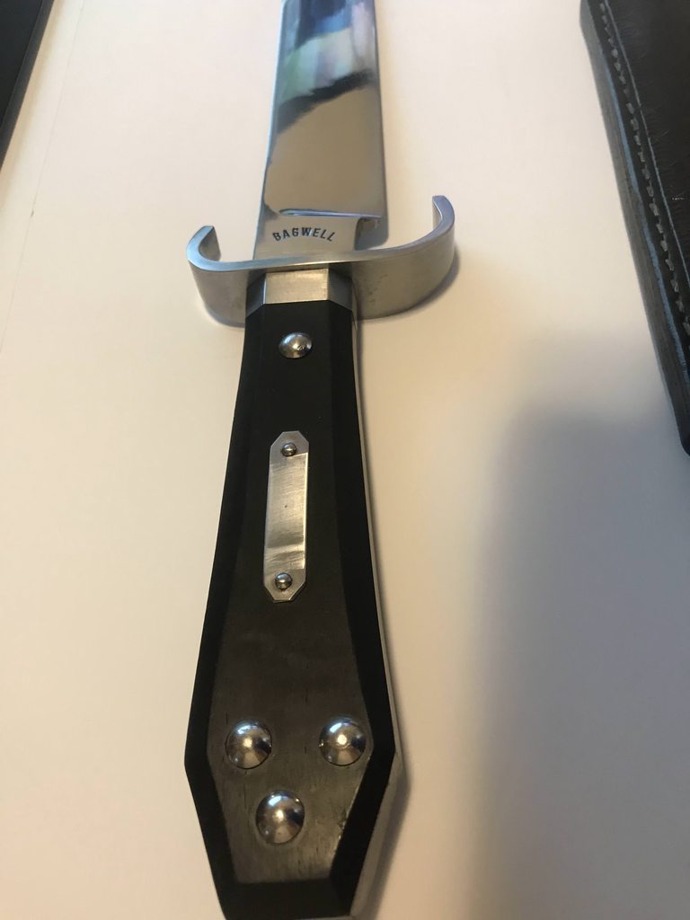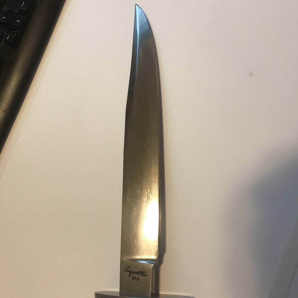 First Bagwell Carbon Helle's Belle. Comes with original sheath. The knife can use a resharpen but absolutely no pit nor damage on the cutting edge.