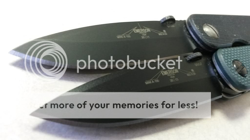 #1 - 2011 Emerson Mini A-100 BT - Serial Number 766 - its in excellent used shape. I'm the original owner, original box included. I have carried it and used it lightly - but as you can see from the pictures the blade and everything is in fabulous shape. I did disassemble, clean, and lube it once. Factory edge - never touched up. Still sharp. This is a GREAT blade. The blade is a tad off-center when closed but I keep my pivots a tad looser than most - so it might be able to be centered without doing much. Only visible wear is from standard pocket carry on the pivot screw and bolt a little. Other than that its like new! Emerson's price is $185 on these, $160ish from dealers, I'm asking: WITHDRAWN shipped