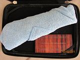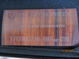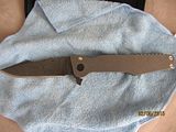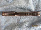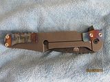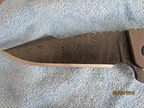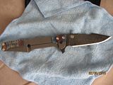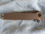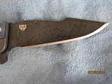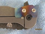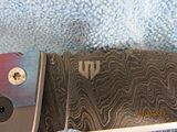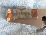 Titan 2. Absolutely new, never used, just as I received it from Will. Stonewashed .235" thick, 7" long slabs, .23" thick, 4.6" long drop point harpoon blade in redneck skin pattern Damascus containing (4) layers 5160, (3) layers 203E, (3) layers 52100, (3) layers 15N20 with stainless S35VN backspacer. This is one of the few set up with right hand tip up carry with flamed clip and lock bar stop. Customized zipper case with certificate of authenticity and the official shop towel of Woods Bladeworks. $1400