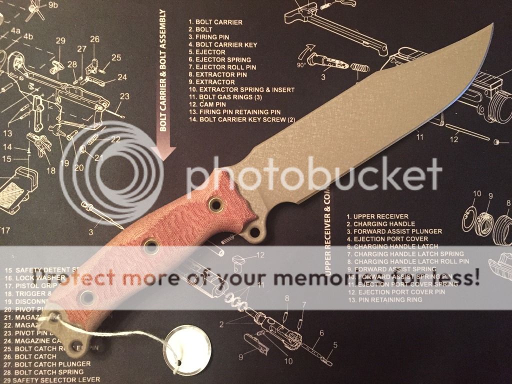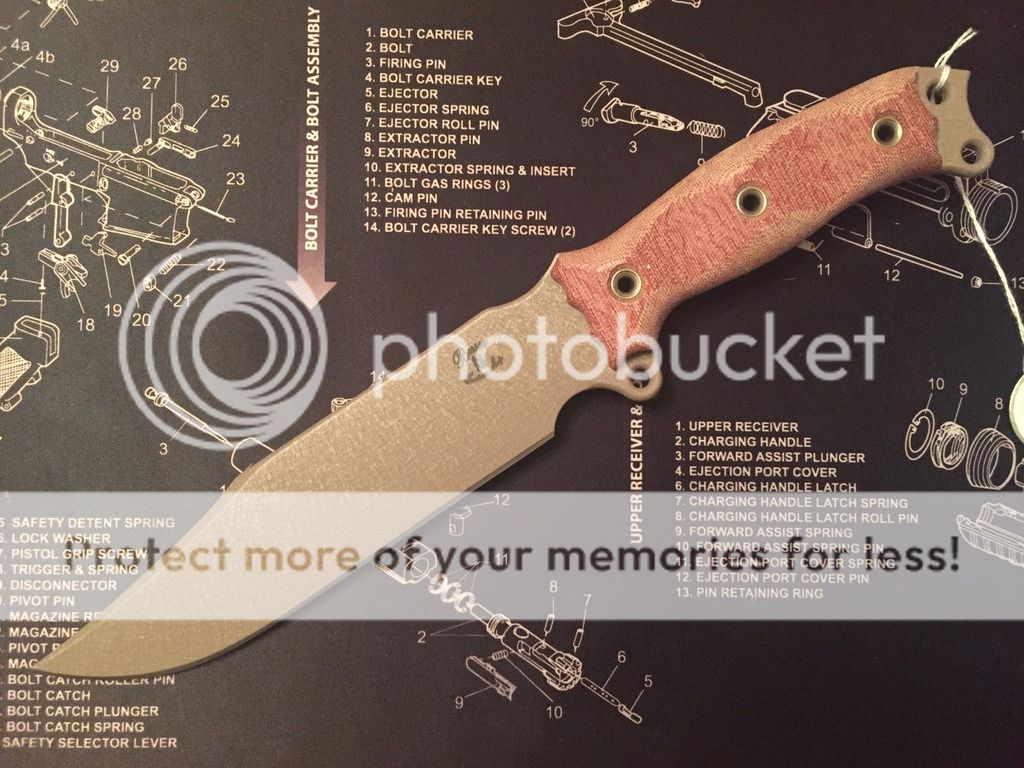 SOLD NMSFNO variant - INFI desert tan clip point/bowie custom shop variant, tan micarta handles, tactical cardboard sheath. $500 SOLD