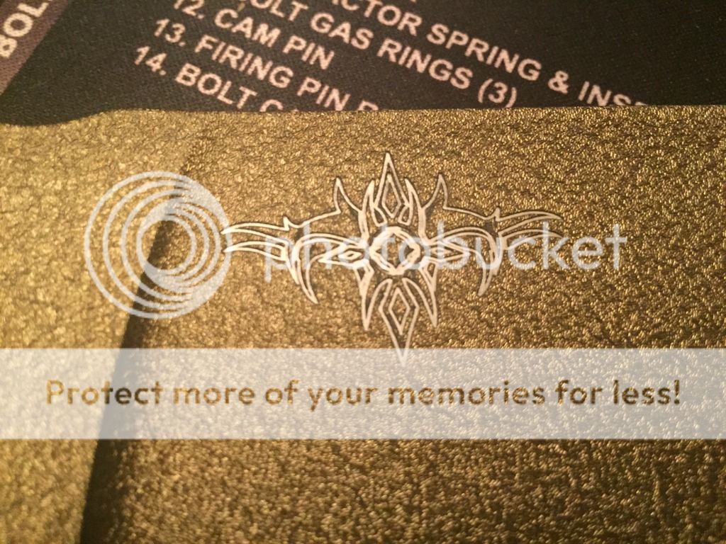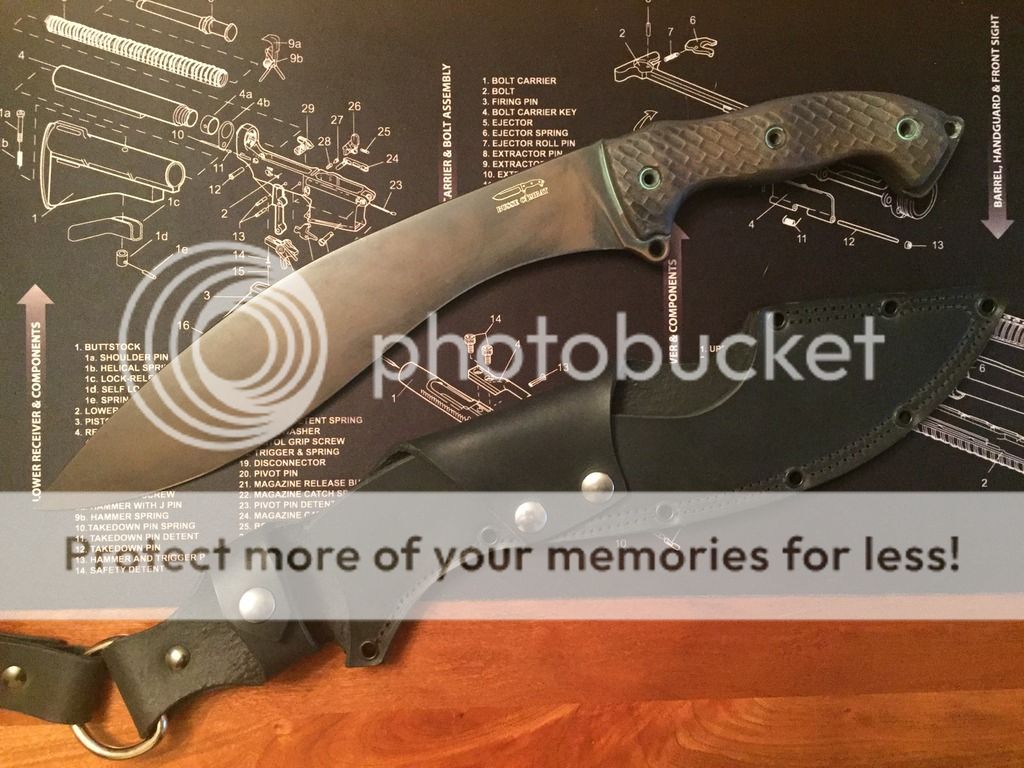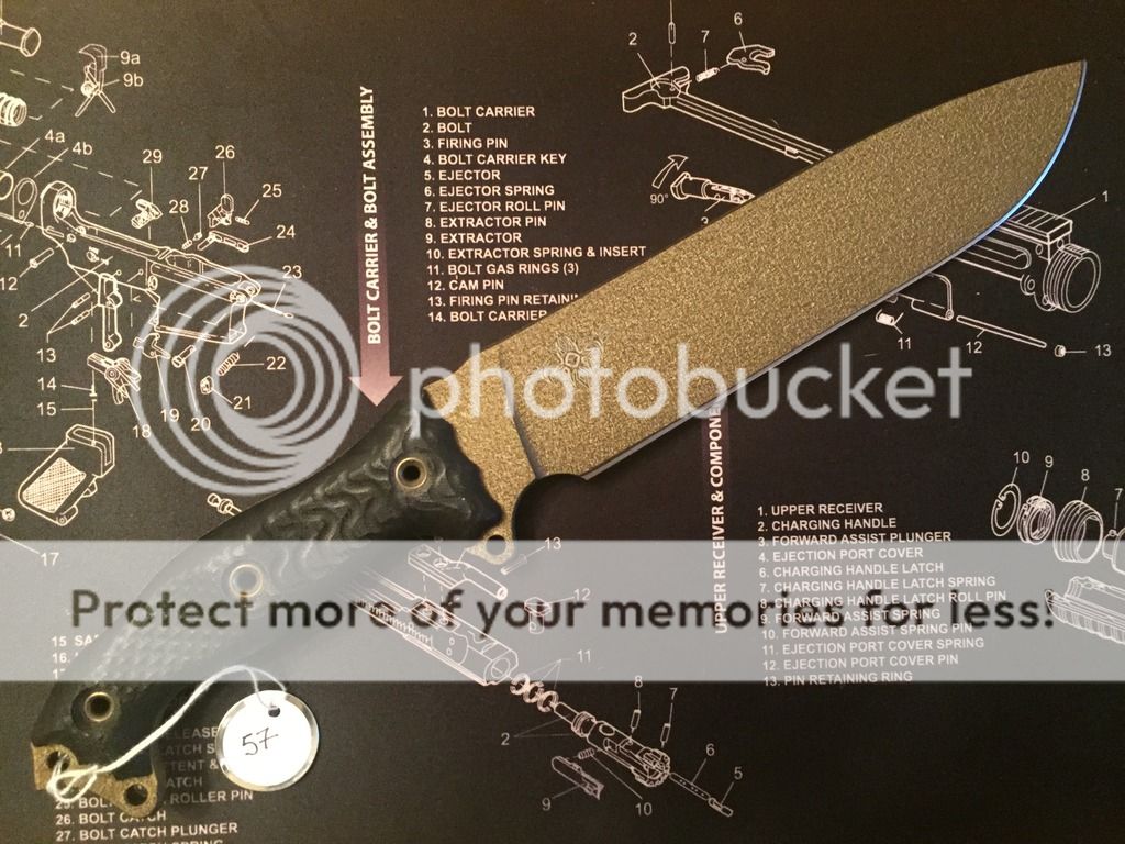 SOLD NMFSH - INFI bronze with Garth's tramp stamp etched on it, black G10 handles, tactical cardboard sheath. $580 SOLD