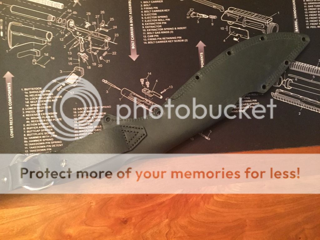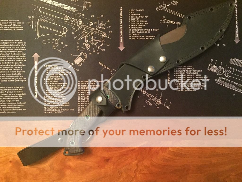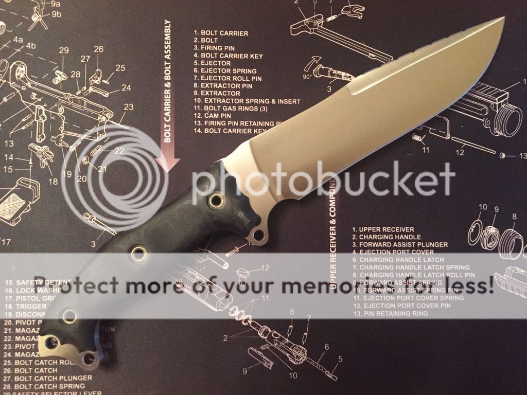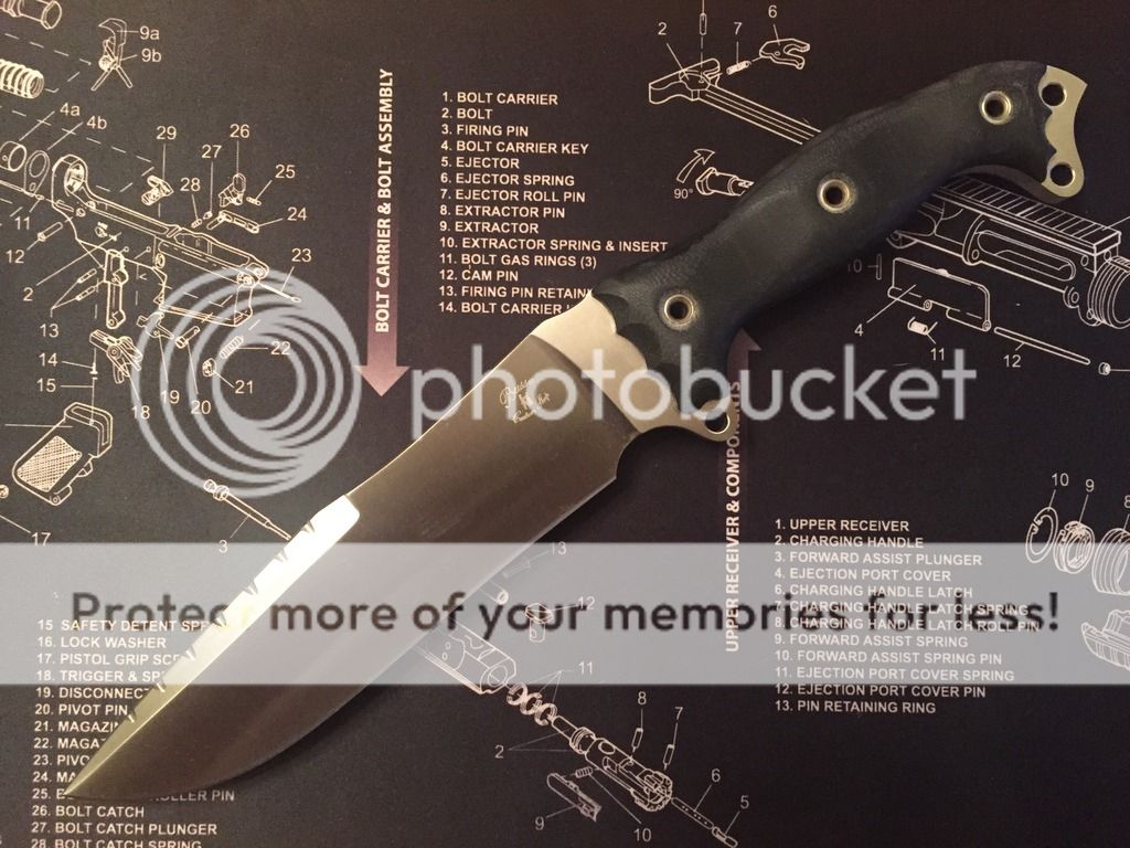 HOGFSH variant - INFI satin with nuclear serrations on the swedge, black G10 hand smoothed handles, tactical cardboard sheath. $900