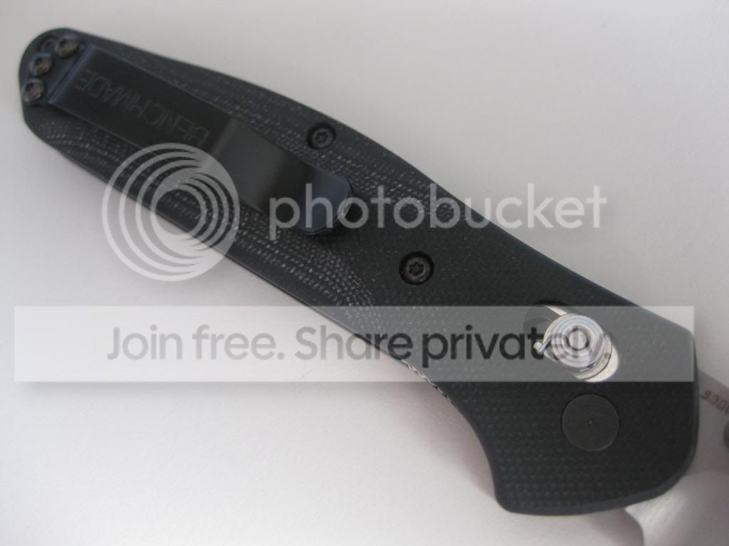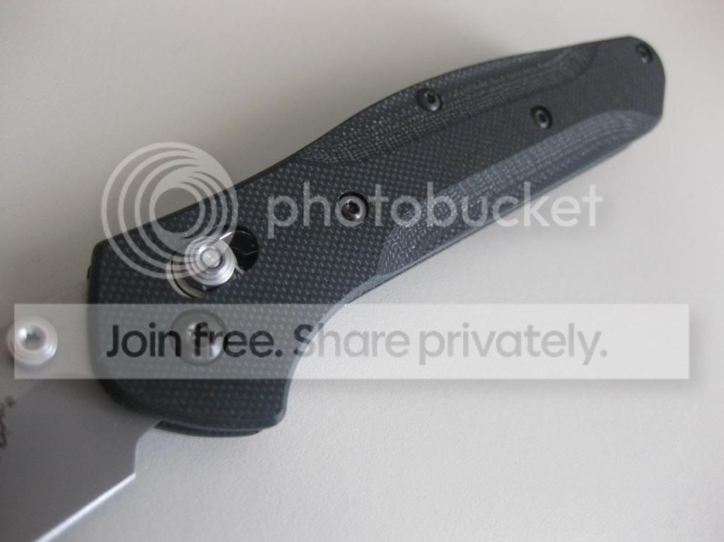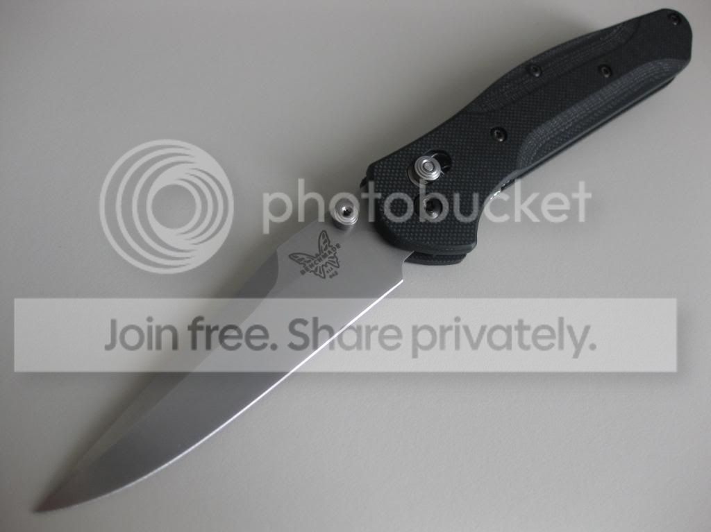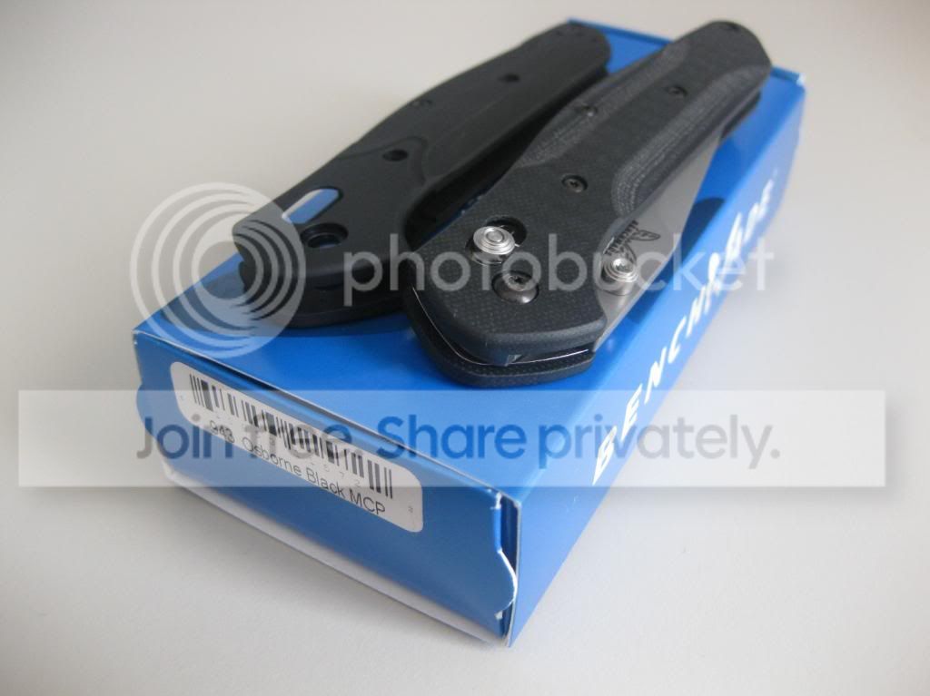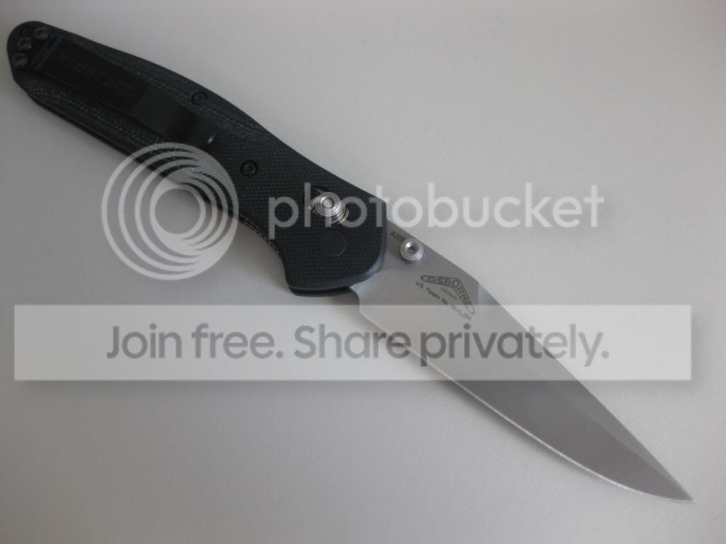 Up for sale is a LNIB Benchmade 943 with custom black G-10 Death Grips. The scales were made by a forum member here, deathofallthings. The fit and finish of the scales is superb. These scales have an open construction with silver barrel spacers installed. The scales were installed but the knife has never been carried, never cut anything, and never sharpened. You will get the knife with the custom scales installed, the original black aluminum scales, the original 943 box, microfiber bag and warranty card.