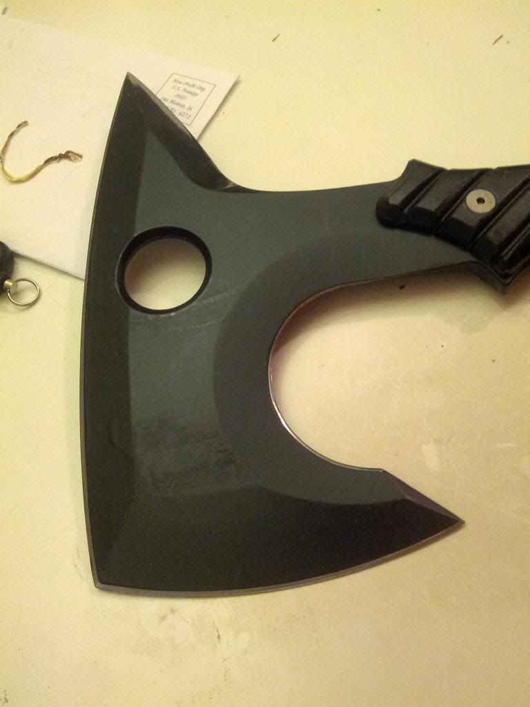 This came to me as a demo / user from Jared. Anyone not familiar with his work can find it here : http://sre.belosic.com/. This hawk is the smaller version of his Anubis and was really the perfect size in my opinion. This one has a Black Durakote finish on both the steel and handle, The K9 Skull Crusher Pommel, sharpened Under Beard and Canvas Micarta Handles. It's been a great tool, it just needs a new home. The handles were modified by a friend and I to give them more grip after I applied Dura Kote. Please note that non uniform filing was my doing and not Jared's, his work is awesome and this hawk is no exception. The Dura Kote was also applied after purchase. This is definitely a user and is priced to reflect that.