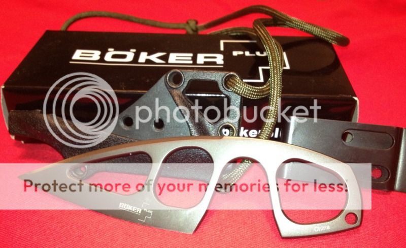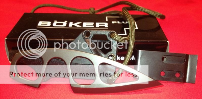 Next is a NIB Boker MA-2 defense/concealment knife. Features a coated 440C blade and a design that locks into the hand allowing you to grip other things as well. Kydex quick release sheath with steel belt clip and 550 cord lanyard. This knife has not been used, carried or sharpened. It does have some very light sheath marks on the finish. Includes box, papers, etc.