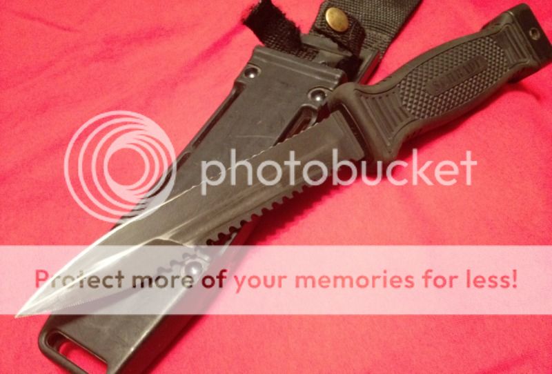 This knife features a 6.5" parkerized high carbon double edged blade with straight, serrated and saw edges. It is a full tang design with rubberized grip and hammer pommel. The rigid nylon jump sheath features multiple attachment points and a ceramic sharpening stone built into the back.
