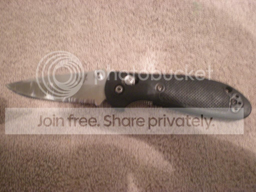 1. Benchmade mini-grip half serrations- (TRADED) Ordering a new one next month so this one can go. It's a user with several scratches on blade and clip. Smooth as silk axis lock and would make a great EDC.