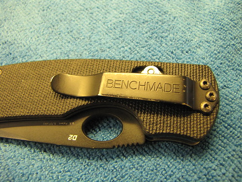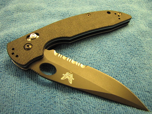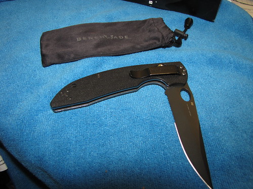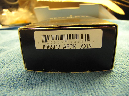 First up: the Benchmade AFCK 806 D2 Axis lock with CE. Carried one maybe two times. Never cut anything, but crappy ppaint on clip shows some marks from this. Edge is factory, secondary bevel is even to my eye, lock up is good, blade is 'very' close to centered. No marks that I'm aware of on knife other than clip. Love the axis lock, love the smooth feel and quality, not a fan of the combo edge or the blade shape on the AFCK. Carries well for a larger folder. Comes with papers, bag and box. TRADED.