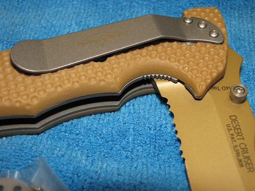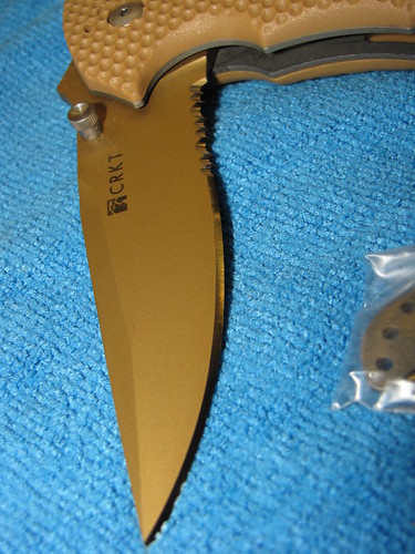 Third: CRKT Desert Cruiser, Hammond Collboration, has secondary lock, AUS8 steel, partial serrated, LNIB, Never carried, just fondled, comes with papers, box, spare clip, and screws. Bought because I like the brown colour and gold finish blade, the feel in hand is awesome. Factory edge is sharp, as good or better that the above two knives, Secondary bevel is not even between front and back sides. Its just too thick to practically carry in an office environment which is where I work 9-5, M-F, and again not a fan of partially serrated blades.