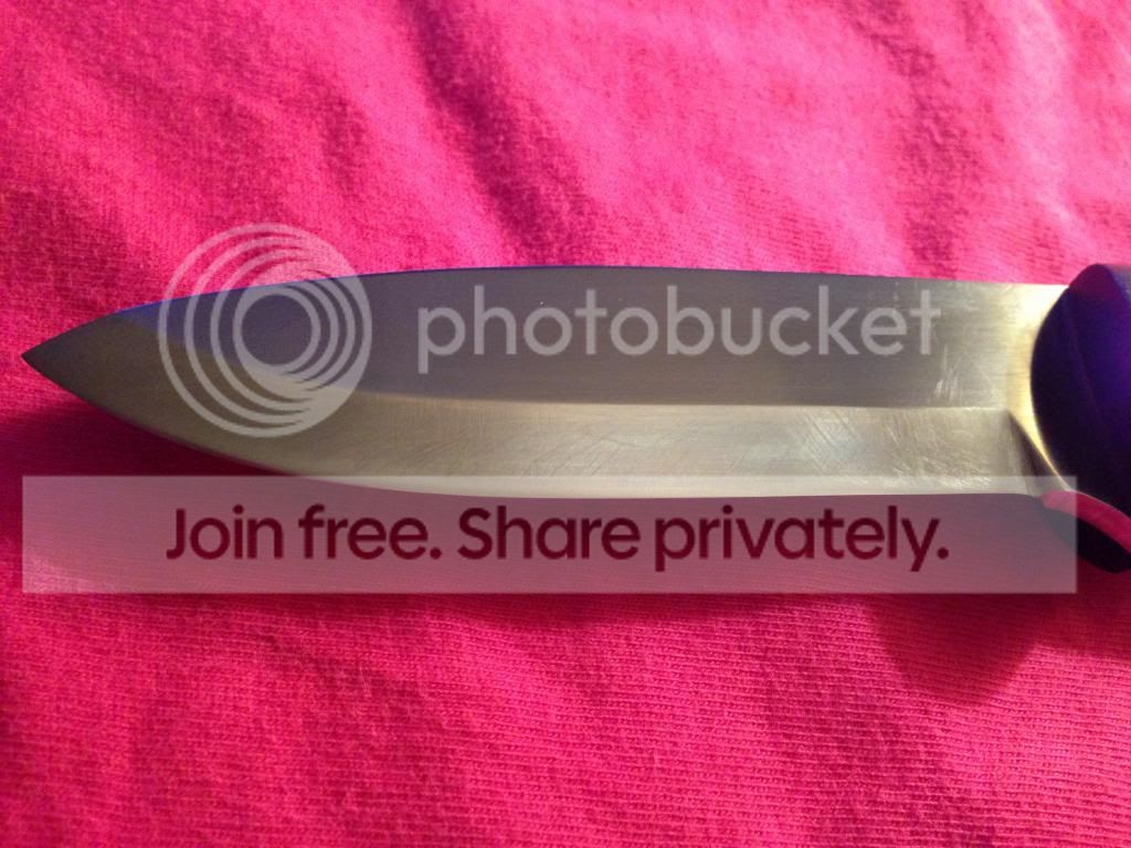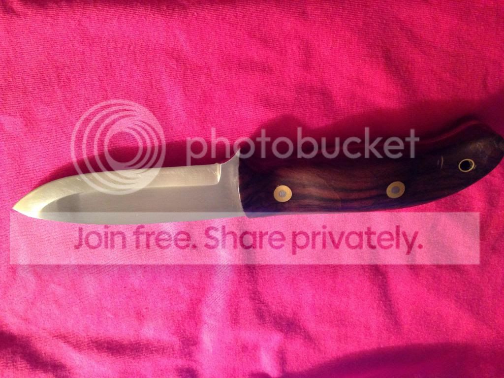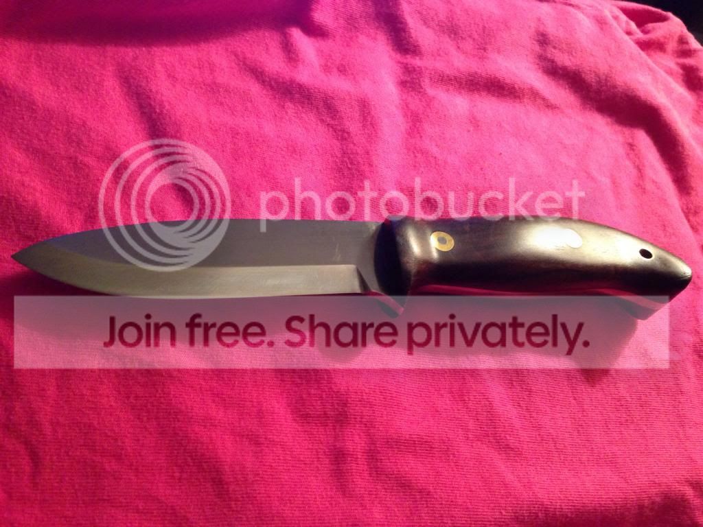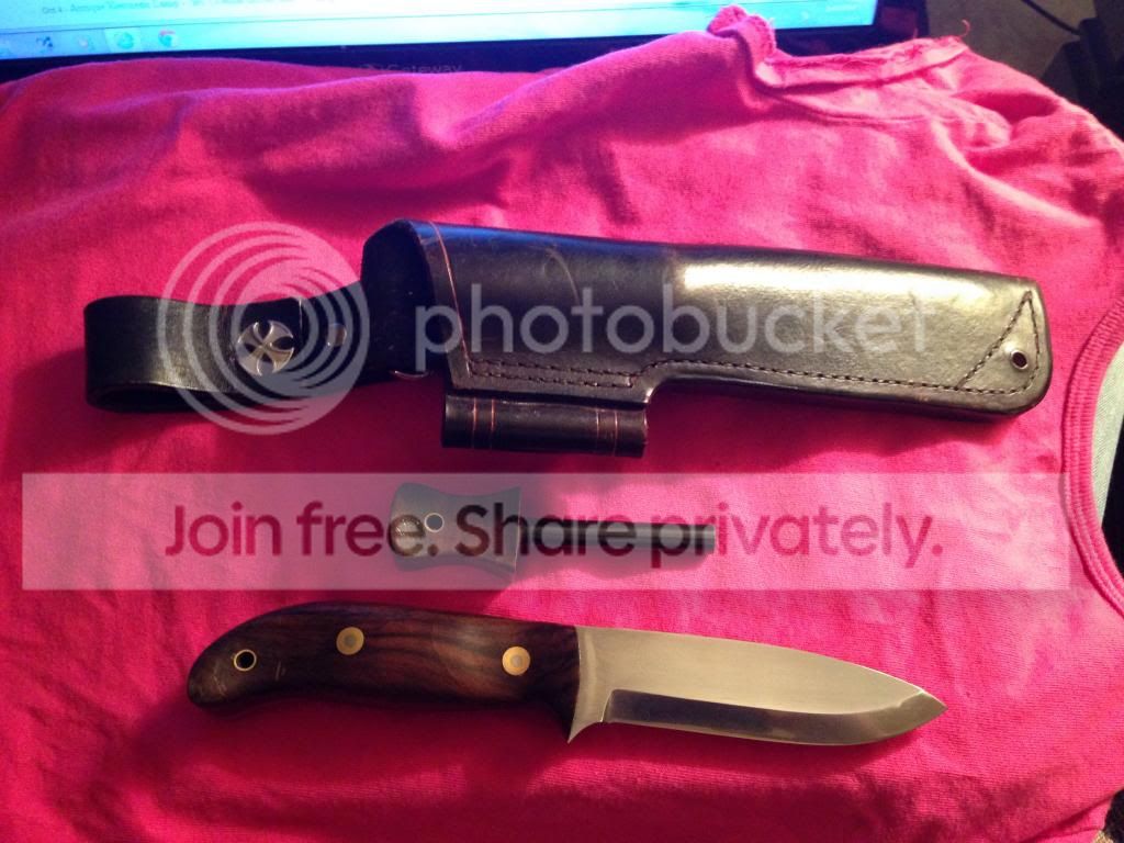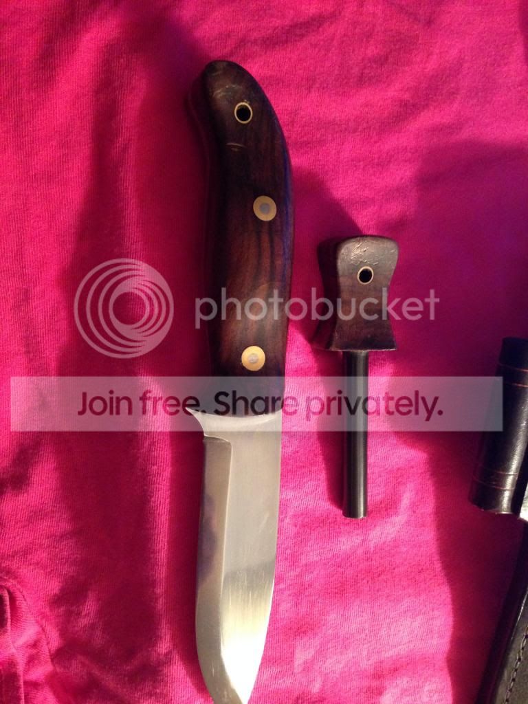 This is the "Timberwolf" bushcraft knife made in the UK by Gary Mills. It features a 220mm scandi ground blade in O-1 tool steel with Turkish walnut scales. It comes with matching fires feel and leather sheath. It is well used with surface scratches, abrasions, and a few small chips out of the spine from flint/steel fire making. The wolf paw emblem and Gary mills signature are still lightly visible, and there is a mild patina forming on the exposed tang. I did very slightly convex the edge to improve strength, and the knife is shaving sharp. I would love to trade for a straight edge Esee-5 or possible a Falkkniven or Busse basic 4. Cash can be + or - depending on offer. Thanks- Jason rj33rb@aol.com