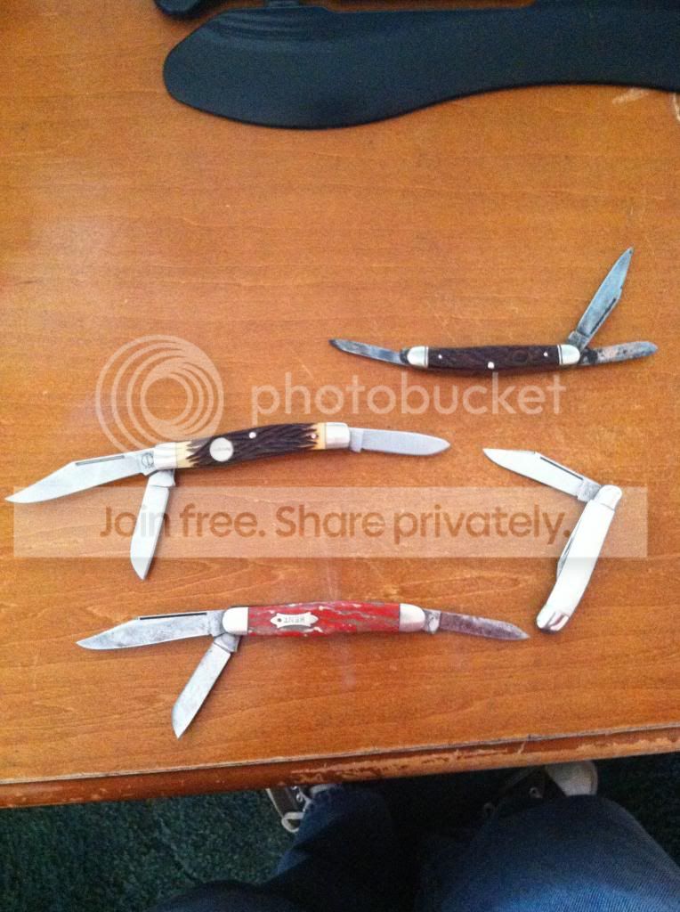 Here I have an old remington usa made stockman,Old kent three blade stockman,hammer brand serpintine jack from the fifties,and old brown jigged bone boker,also have an old frontier stockman from 1977 with original box. Welcoming any offers