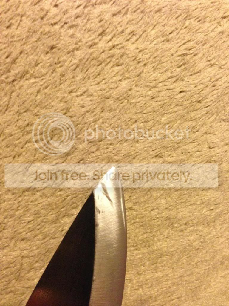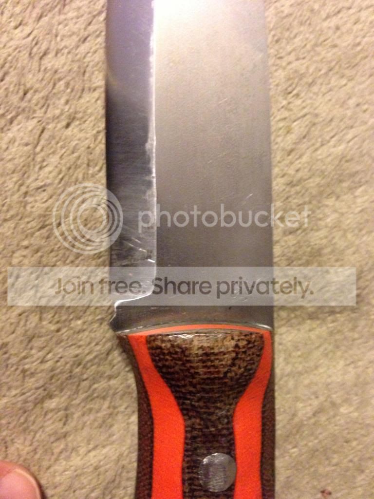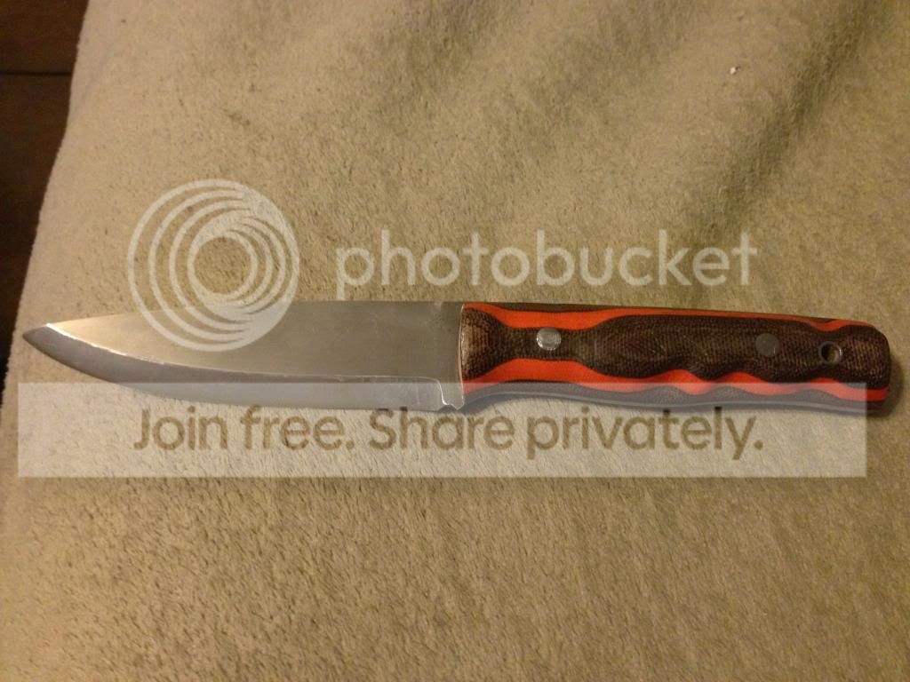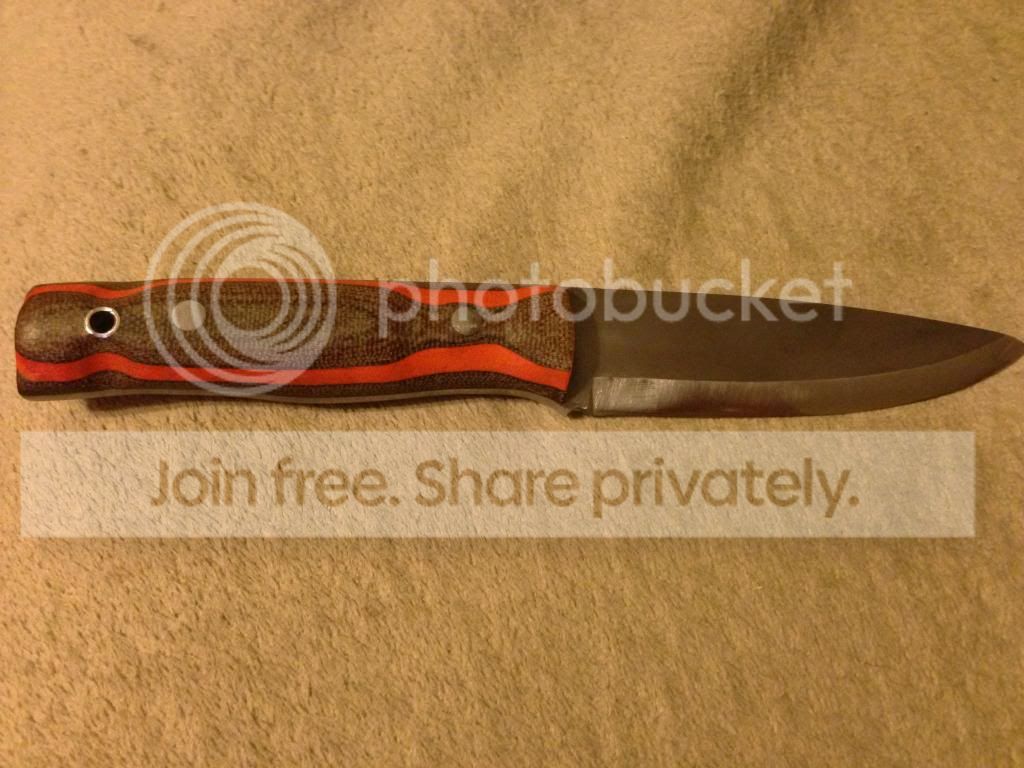 This is a bushcraft knife made in the wood lore type pattern. It's made from 1/8 inch 1084 carbon steel, blade measures 4 1/4 inch, handle is 4 1/2 inch. The blade was heat treated to 58-60 Rockwell, then triple tempered. The edge is a scandivex type grind, there are 2 areas that need to be "fixed" or repaired due to an unqualified knife sharpener at the local flea market. The micarta handle is ugly but functional, if I was going to keep the knife I would do a rehandle and skeletonize the tang to reduce weight. In short the knife is functional, but would benefit from a reconditioning. I tried to show the messed up grind spots in the pics. I'm looking to trade for a decent folder for edc, specifically the Spyderco Gayle Bradley, southard flipper, zt 056x, or similar type folder. I can add cash as needed. Thanks- Jason