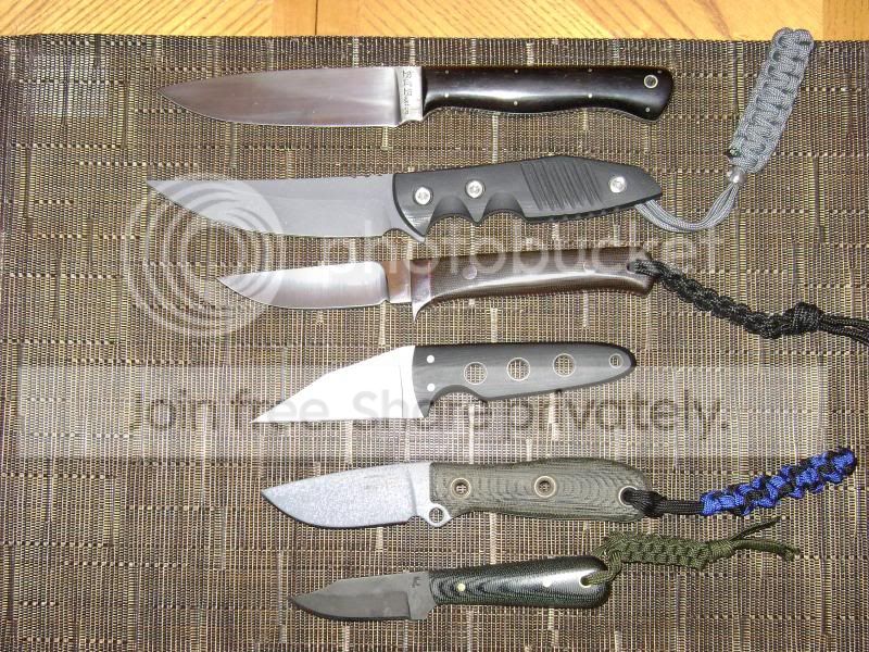 Buxton Bushcraft (light use, blade whispers), Poltergeist Prayen (like new), Baker S30V Loveless Hunter(like new), Spyderco Ronin (has some light oxidation/polishing but was NIB),**TRADED Busse GW (light use), BHK Bowie bushcrafter (like new, polished edge)