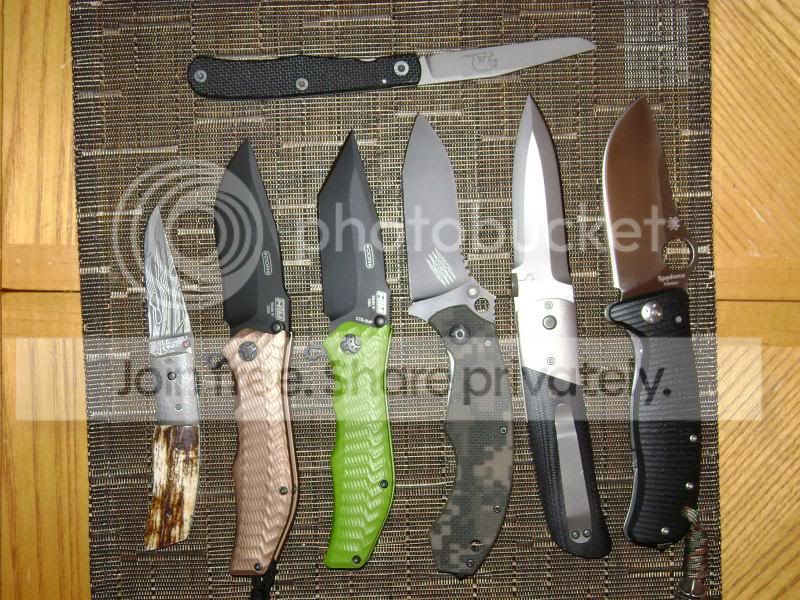 E.L. Iverson Gent's damascus/mammoth tooth(like new), HTM FDE Bowie Gunhammer (light carry, marks in the DLC/handle), HTM CTS-XHP Zombie Tanto (light carry, marks in the DLC/handle), **TRADEDBastinelli BBR1 (like new)TRADED**, Lightfoot Chisel Spearpoint(light carry, whispers on blade/clip), **TRADEDLionspy (light carry, marks on handle from Kami bead), Black Bear ATS-34 Trapper(like new, lock rock)