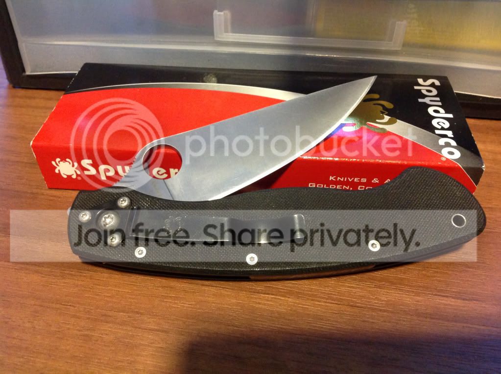 Spyderco Military Satin blade black G10. This has been carried and used, but not for long and not hard. Sharpened on the sharpmaker once. Shows light wear on the clip. Comes with box but no papers.