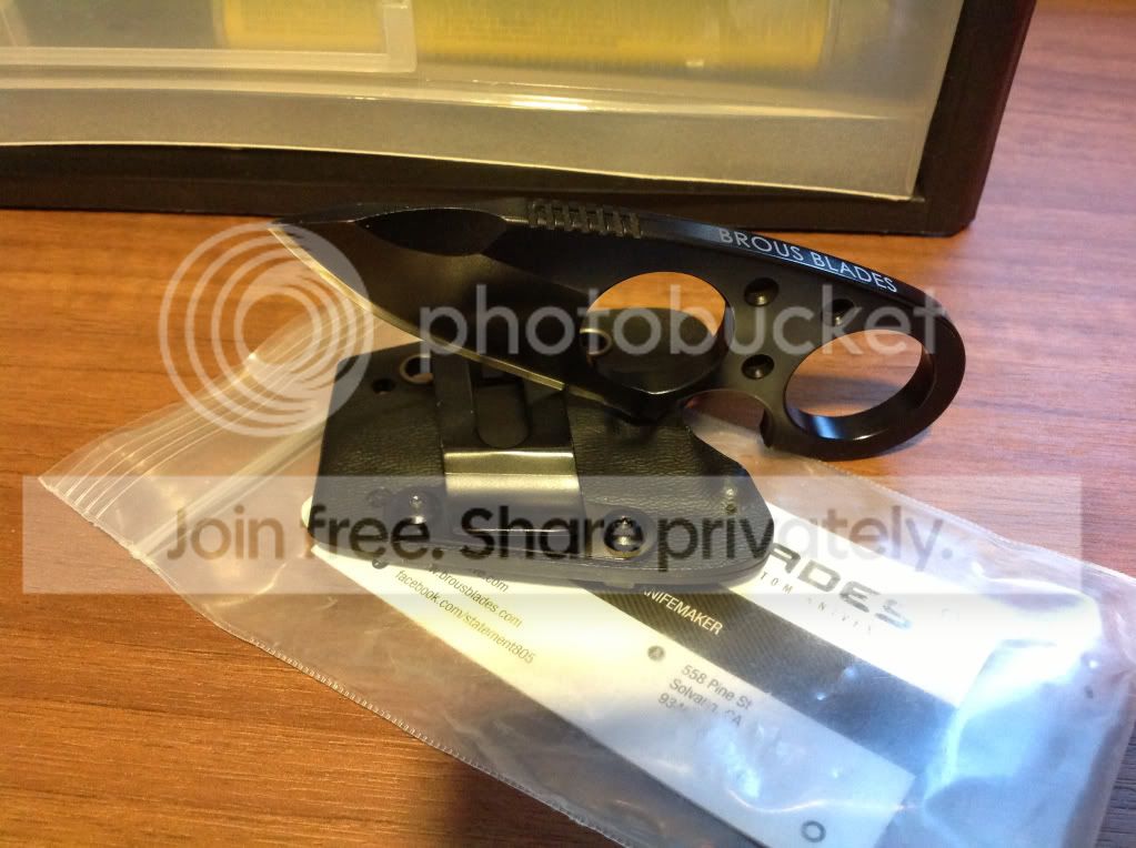 Brous Blades Silent Soldier V2. Light marks from the kydex sheath, the sheath shows some wear on the screws. Comes with bag and chain.