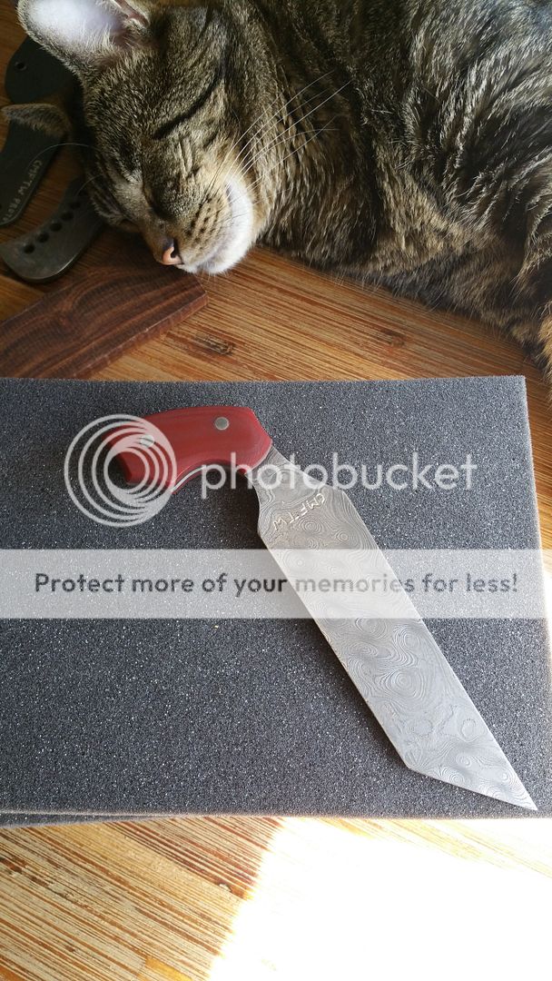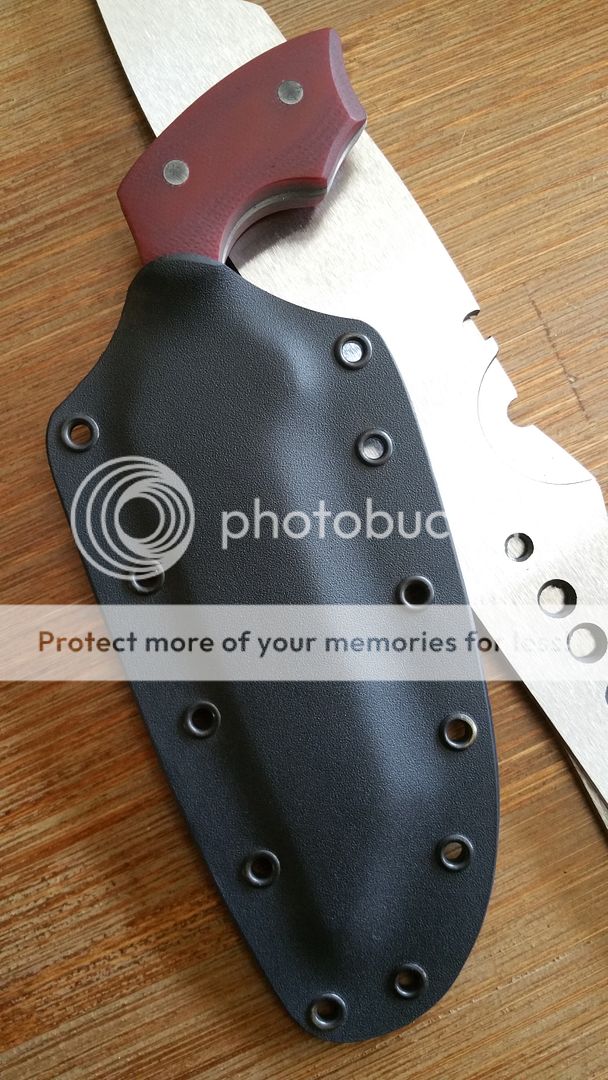 Chisel ground from .150" stock. Handles are dark red G10 with stainless pins. Kydex sheath would be best suited for a figure 8 shoulder rig of 550 cord. Amaze your friends, destroy your enemies... do it all with this discreet tool!