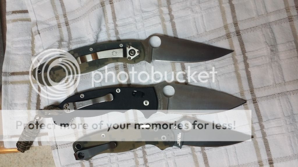 Gayle Bradley regrind nice and thin to be a great slicer had the blade and standoffs cerakoted Black and the scales a bronze to match the contoured lightning strike carbon fiber scales. Has original scales and box as well. I have a good among in this knife. Had been uses to cut some stuff but still in good shape. The coating still looks good. The only thing when the blade is closed on one side you can see a little bit of the metal that I think the tape was a little to high. It is minor bUT you can see. Also missing one scale screw buy the pocket clip. Has a screw it is just not black...WILL ADD DEEP CARRY CLIP FROM PARA 2 $160.