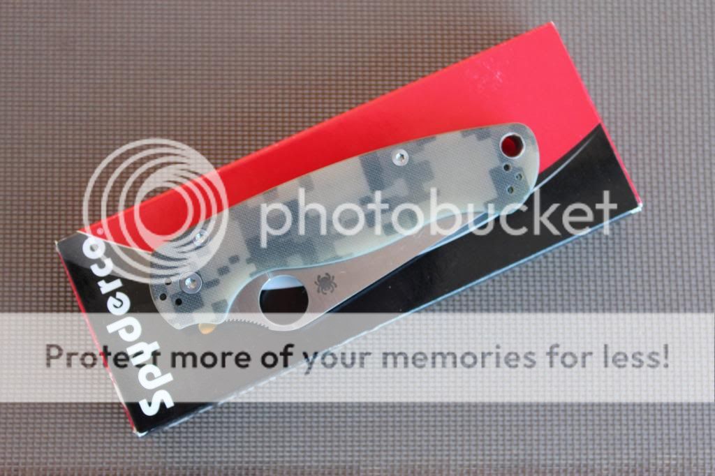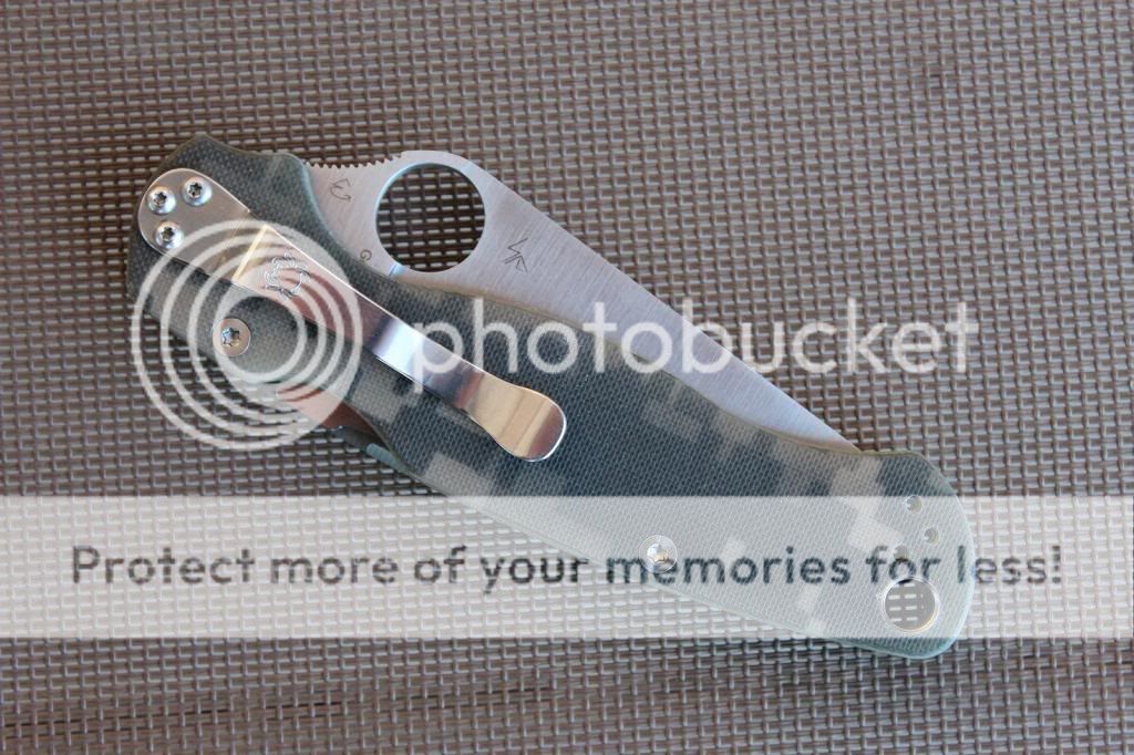 3rd - Spyderco Paramilitary 2 - Camo, Satin blade. Great little knife. Solid, smooth and centered. Very light stick on lock. Great knife, hardly used or carried, pictures will tell the story here. No flaws or blemishes that I can see. Asking $OLD shipped and PP'd