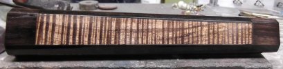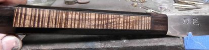 The blade is hand forged damascus made with a core of several layers of 52100 , and sides of 1084, and pure nickel. The handle is made from Curly Koa selected by Mark Farley, and African Blackwood.