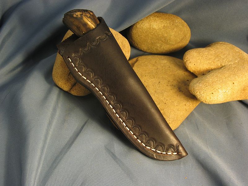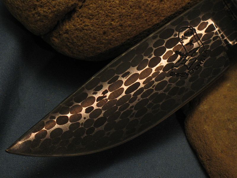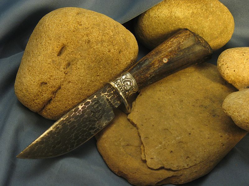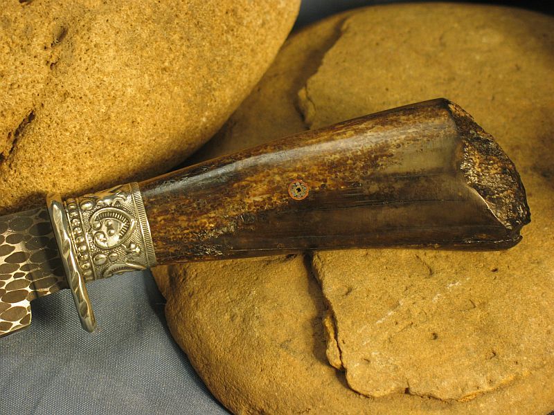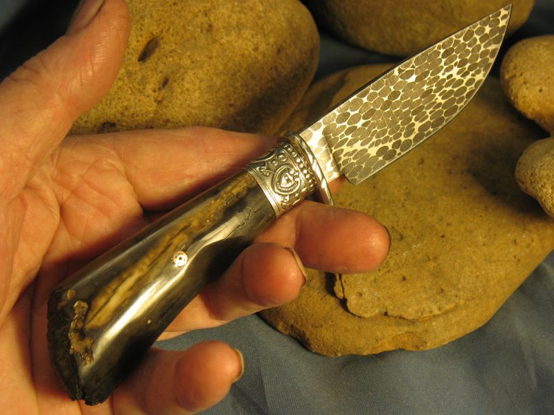This is a new pattern on ths knife and wish to thank Delbert Ealy for tips on this and Jody Durchame for helping with forging pattern. Now specs on this one I just completed of Fossil Walrus ivory , nickel silver, sterling silver ferrule, mosiac pin and my Damascus of 52100 ball bearings and 4600 E powder steel. The balls started as 1/8 dia. The handle is a nice tusk tip with natural end as it came out of the ground and was a hide scraper tool used by Inuit Indians many centuries ago. VERY SHARP and this steel should be about 59 to 60 on rockwell scale. Blade length is 3 1/2 inches and overall length is 7 1/4 inches. Nice leather belt sheath included. Any questions please ask. SOLD and 6.00 priority mail in USA. My e-mail and paypal is dangraves4923@earthlink.net And Yes, I Hope you like it as much as I enjoyed making it.