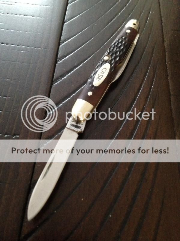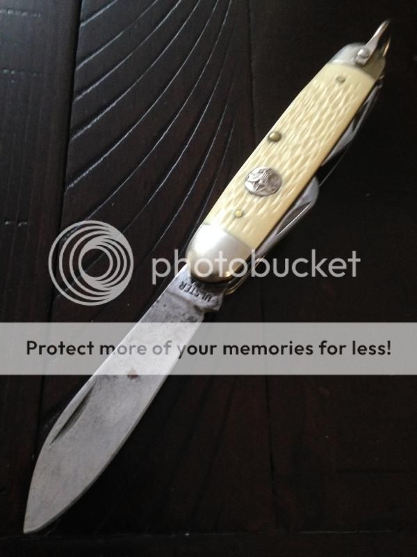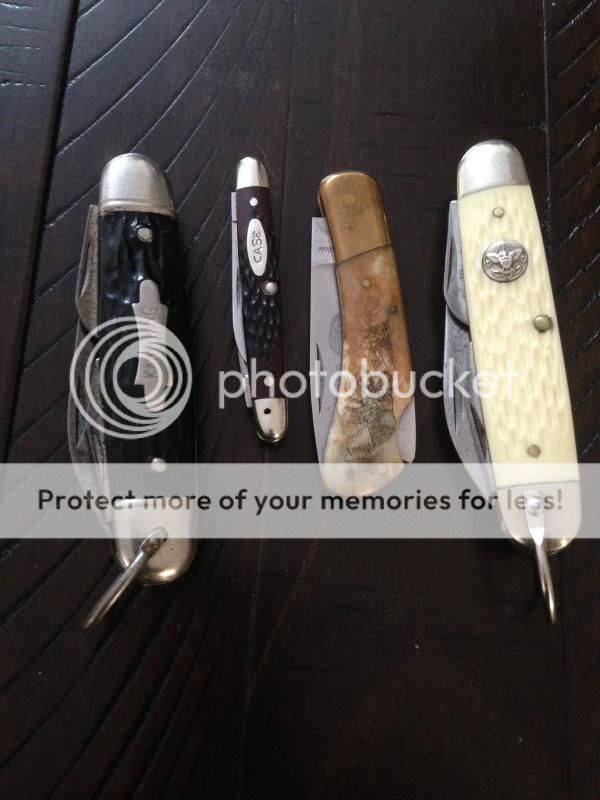 The knife you show appears to have celluloid covers and as I looked at the blades, it appeared that knife has/had been gassing. I just wanted to alert you to the possibility and if so, the knife would be better kept in a box by itself, to protect your other knives from doing the same.