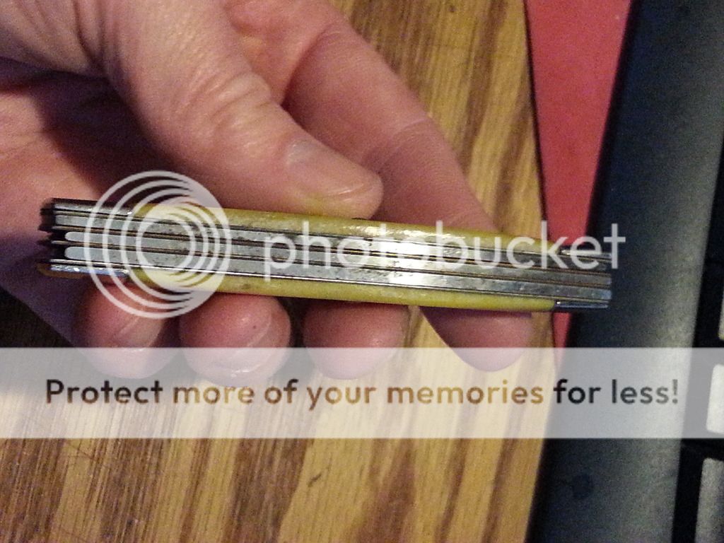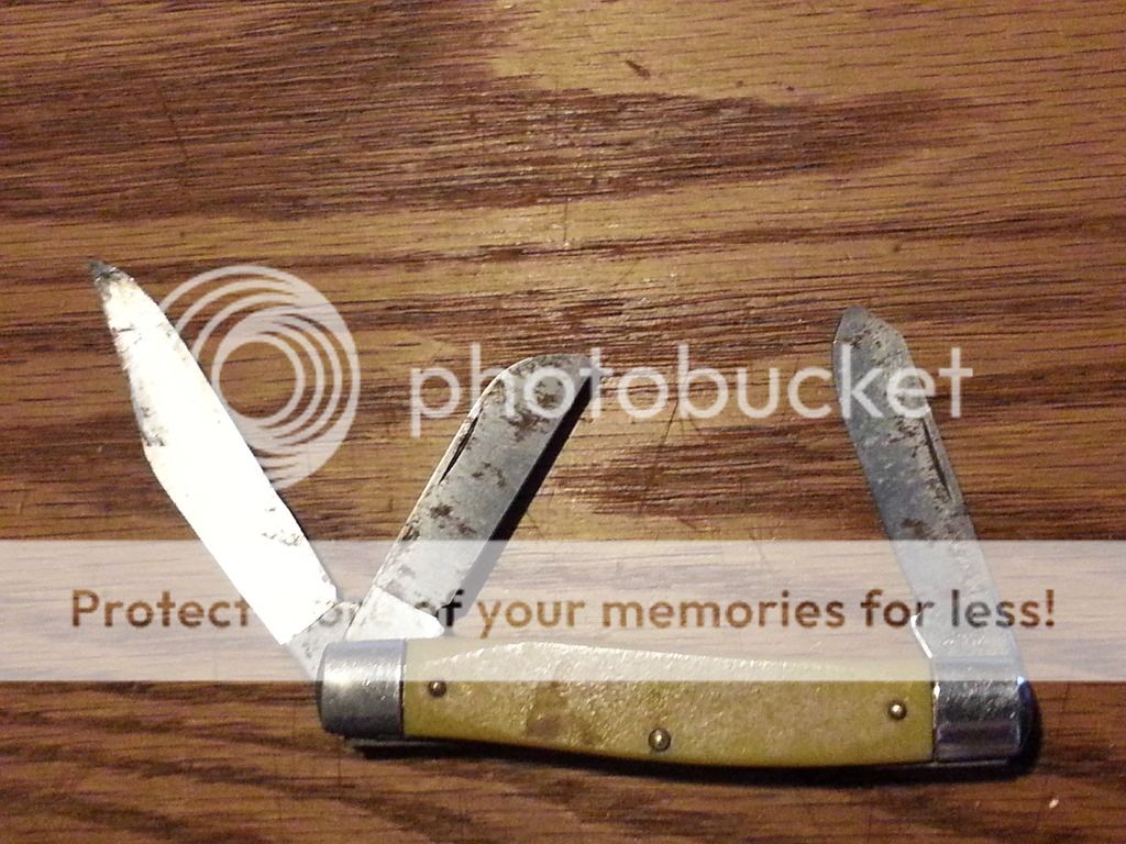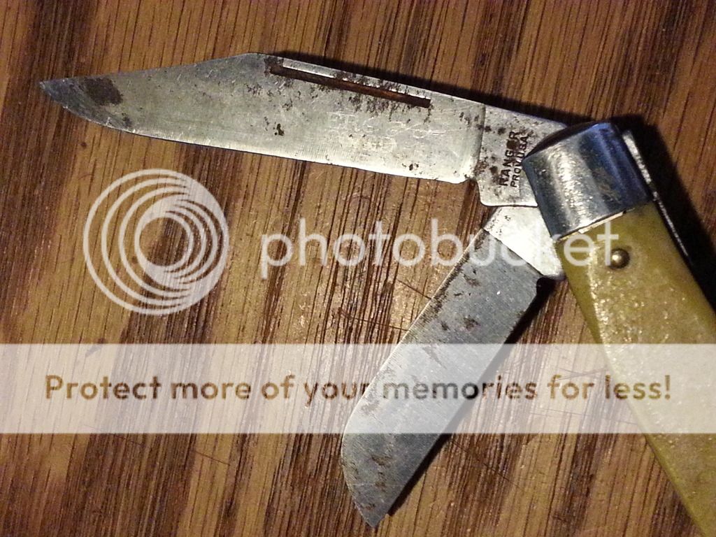 I got this today at an estate sale for $5, and I really think that it is a diamond in the rough. It looks mostly unused and is in excellent shape with good snap. It just looks like it needs the spa treatment. It isn't a high value collectible and does not have exotic handles, but it is just a nice knife. It is unusual to me in that it is a 3 blade stockman with 3 springs. That's new to me anyway. It is 3 7/8" closed, and the main blade is etched "Ranger Ultra Honed".
