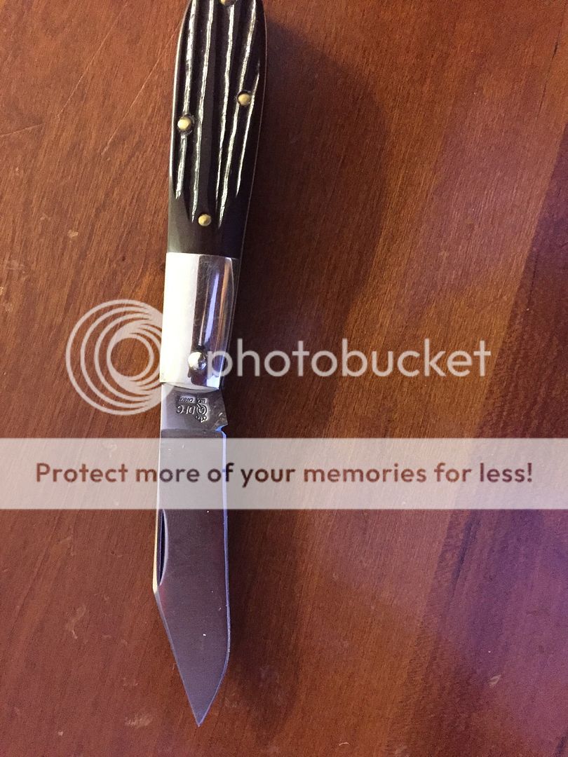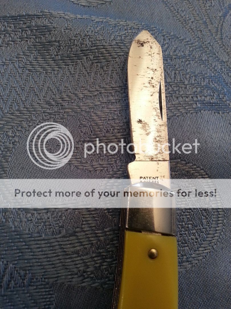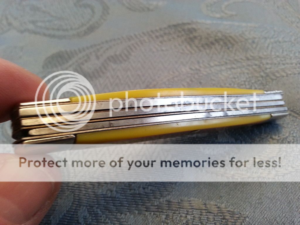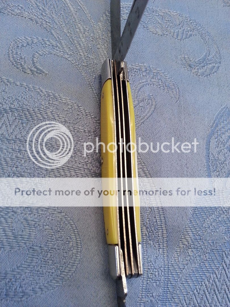 Dating this knife has not been easy, as it doesn't seem to be a popular marque (though Fremont was purportedly the center of the cutlery universe at one time). The company was established in 1887, though from the scant information available online and in Goins' it appears Henrie reestablished Clauss in Fremont sometime between 1917 and 1920. I suspect this particular knife might be post-1954, when the company changed names from Henkel-Clauss Company to Clauss Cutlery Company, though there is information that the cursive tang stamp was in use as early as 1892 and I've seen fixed-blade versions with the same stamp dated to the 1930s. I imagine it'd be easier to narrow the window down if we could identify the maker (Challenge Cutlery was known to produce knives for them, among others).